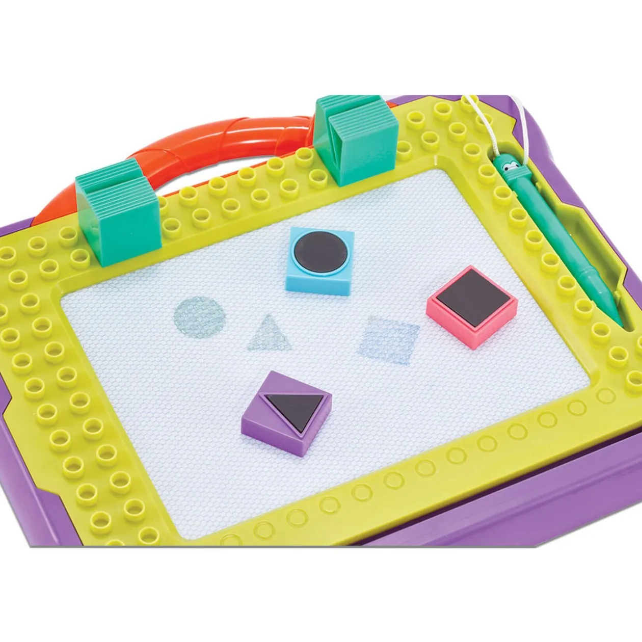 L’ardoise comprend également un stylo, 3 aimants et un support à carte à fixer facilement tels des blocs de constructions.