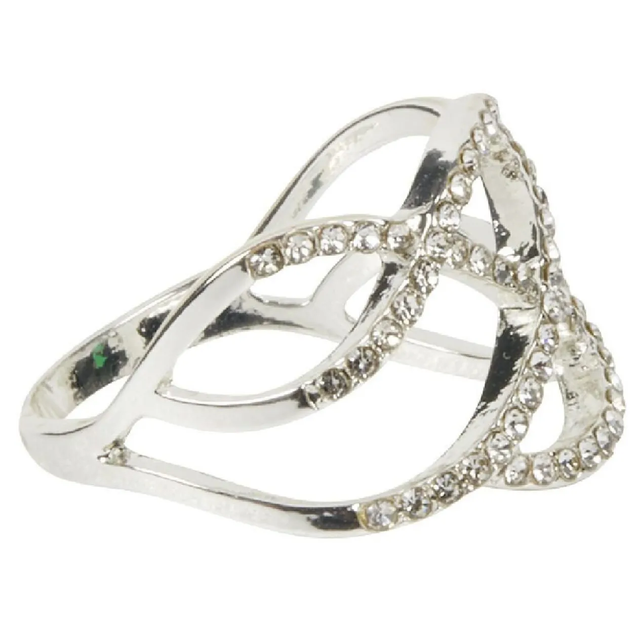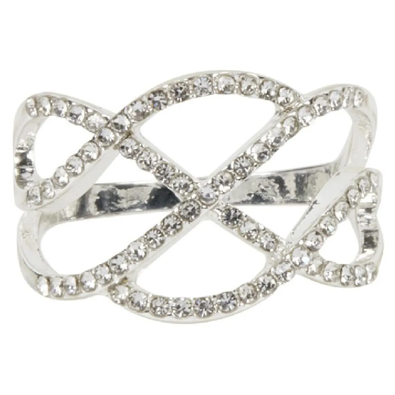 Bague au design entrelacé en métal gris argenté et incrusté strass.