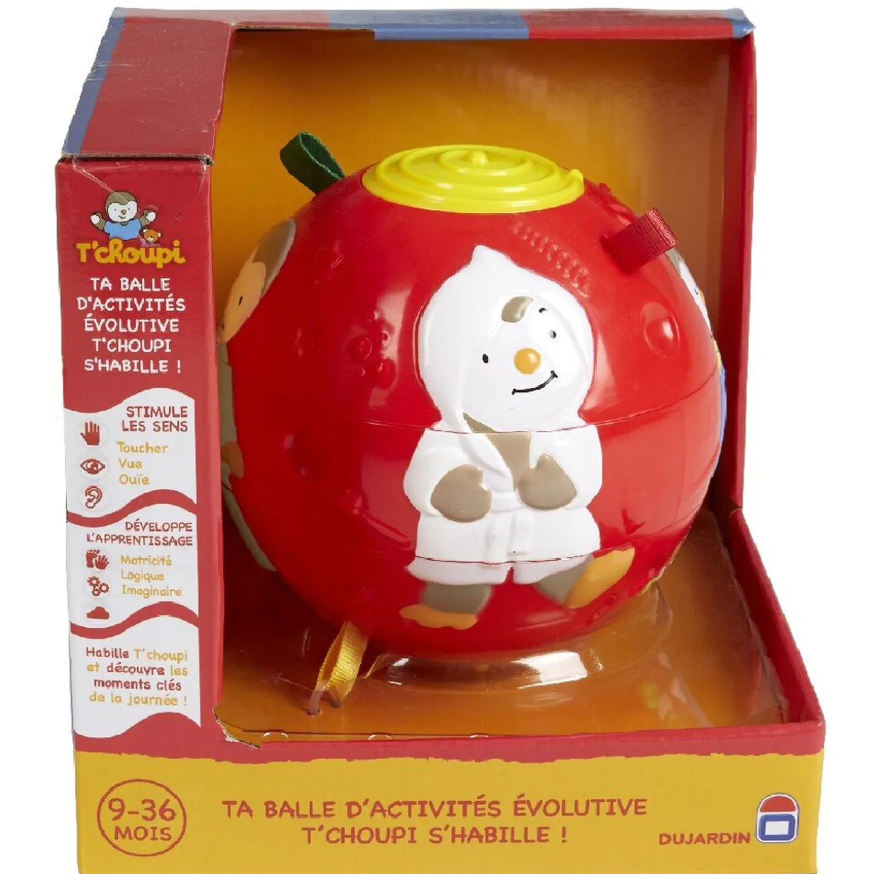Balle d’activité évolutive T’choupi s’habille de Dujardin pour s’amuser et découvrir les moments clés de la journée. Bébé pourra reproduire à l’infini les 4 T’choupi en tournant simplement les trois parties qui composent la balle.