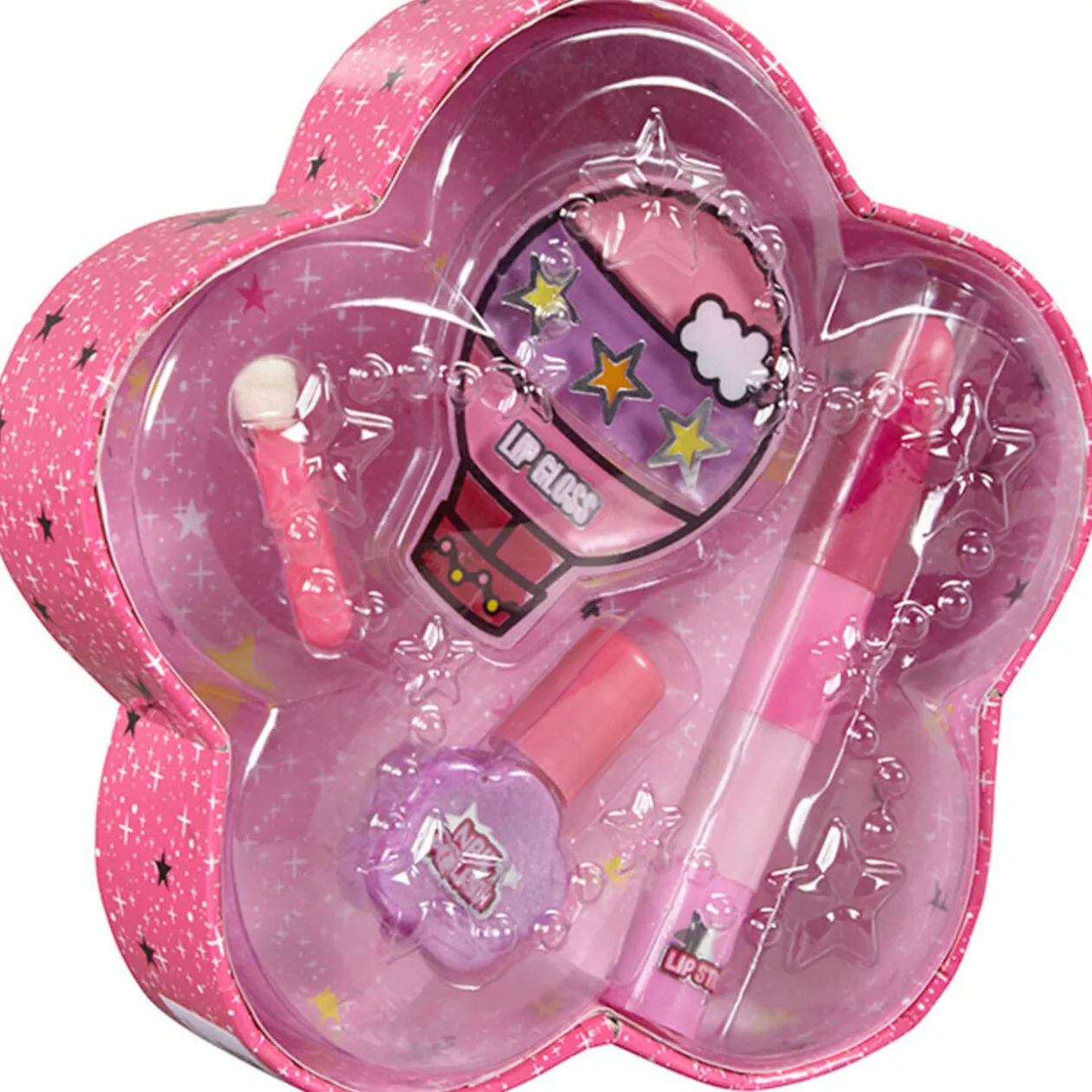 Boîte de maquillage en forme de fleur, dim. 15×4,5×12,5 cm, plastique. Comprend rouges à lèvre, gloss, applicateur et vernis. Dès 5 ans.