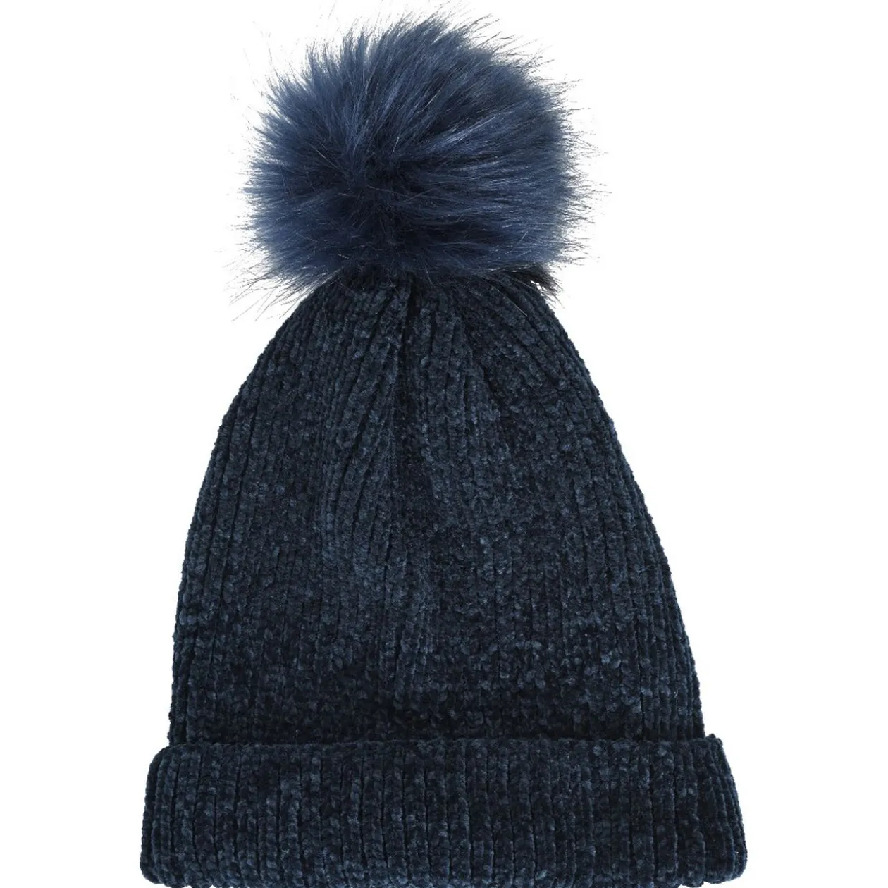 Bonnet en maille acrylique chenille uni bleu avec pompon.