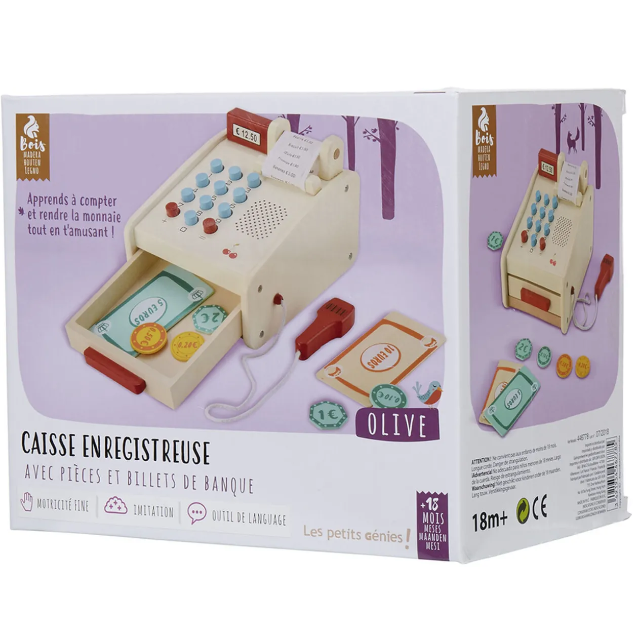 Bip les articles, appuie sur les touches, compte et range la monnaie dans le tiroir, cette superbe caisse enregistreuse en bois est parfaite pour jouer au petit épicier du coin! Idéal pour les amateurs de jouets en bois naturel et durable, ce jeu d’imitation fera le bonheur de votre apprenti commerçant!