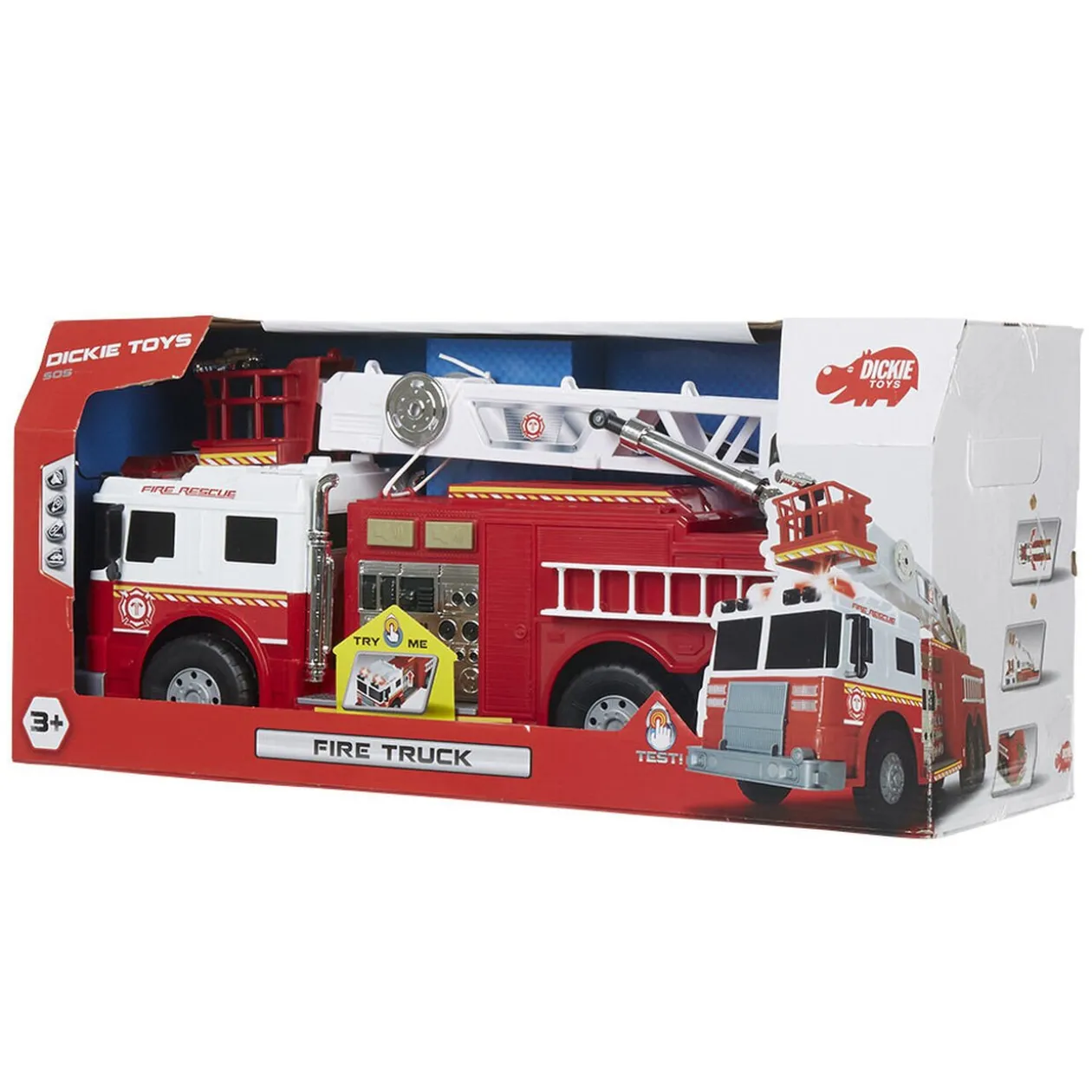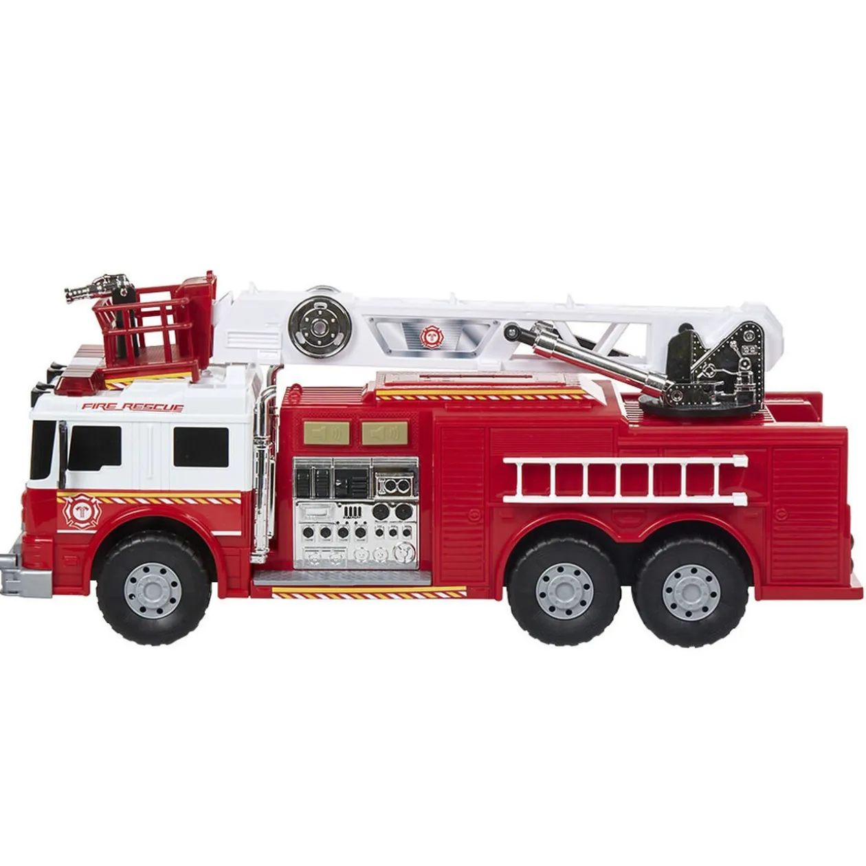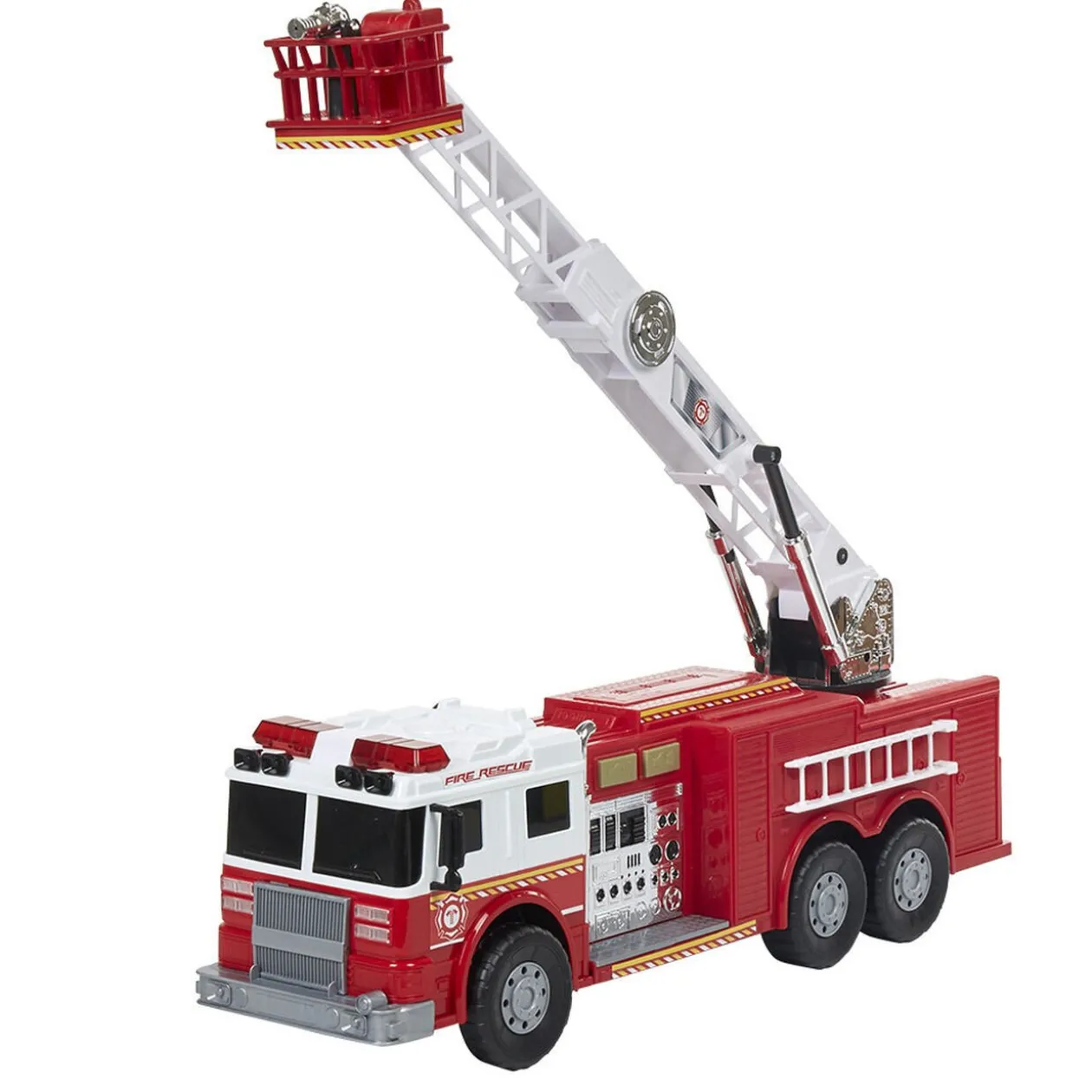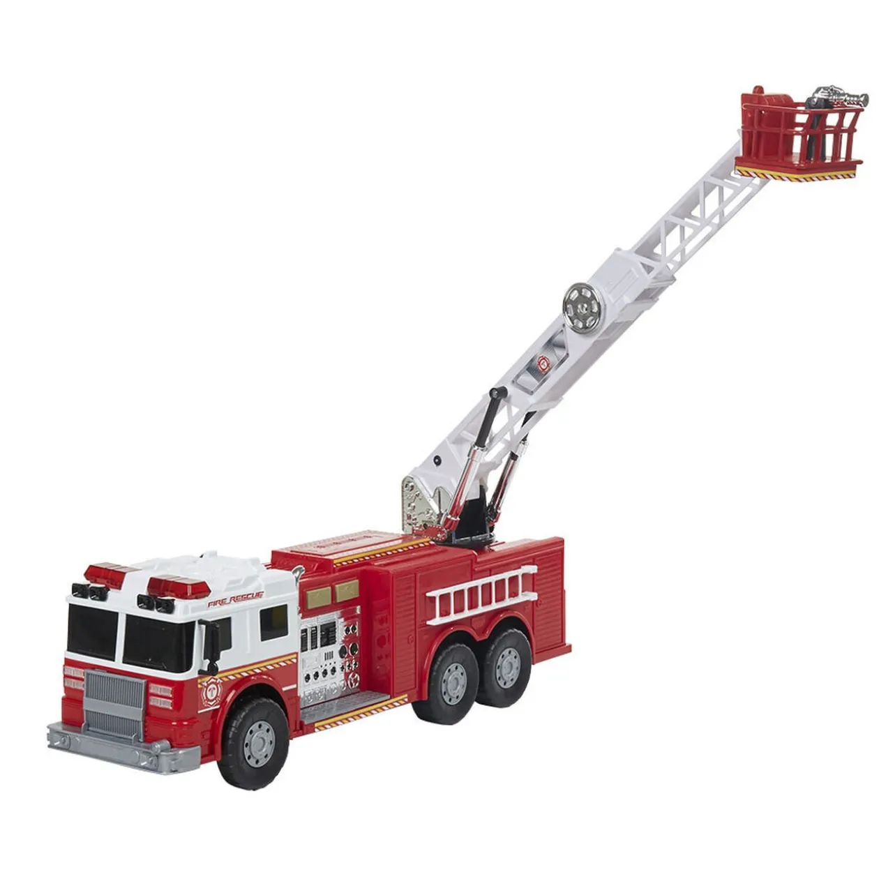 Camion de pompier rouge avec grue blanche, animé de par la sirène qui s’illumine et retentit.Dimensions : 27 x 17 x 19 cm