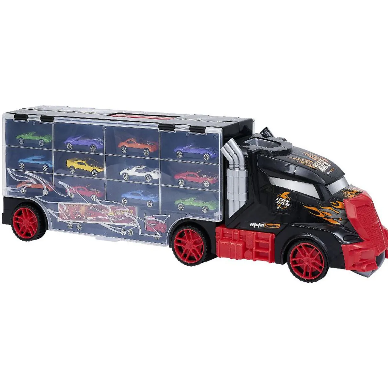 Deviens le roi du transport routier grâce à ce camion transporteur noir et rouge avec motif flammes orange.