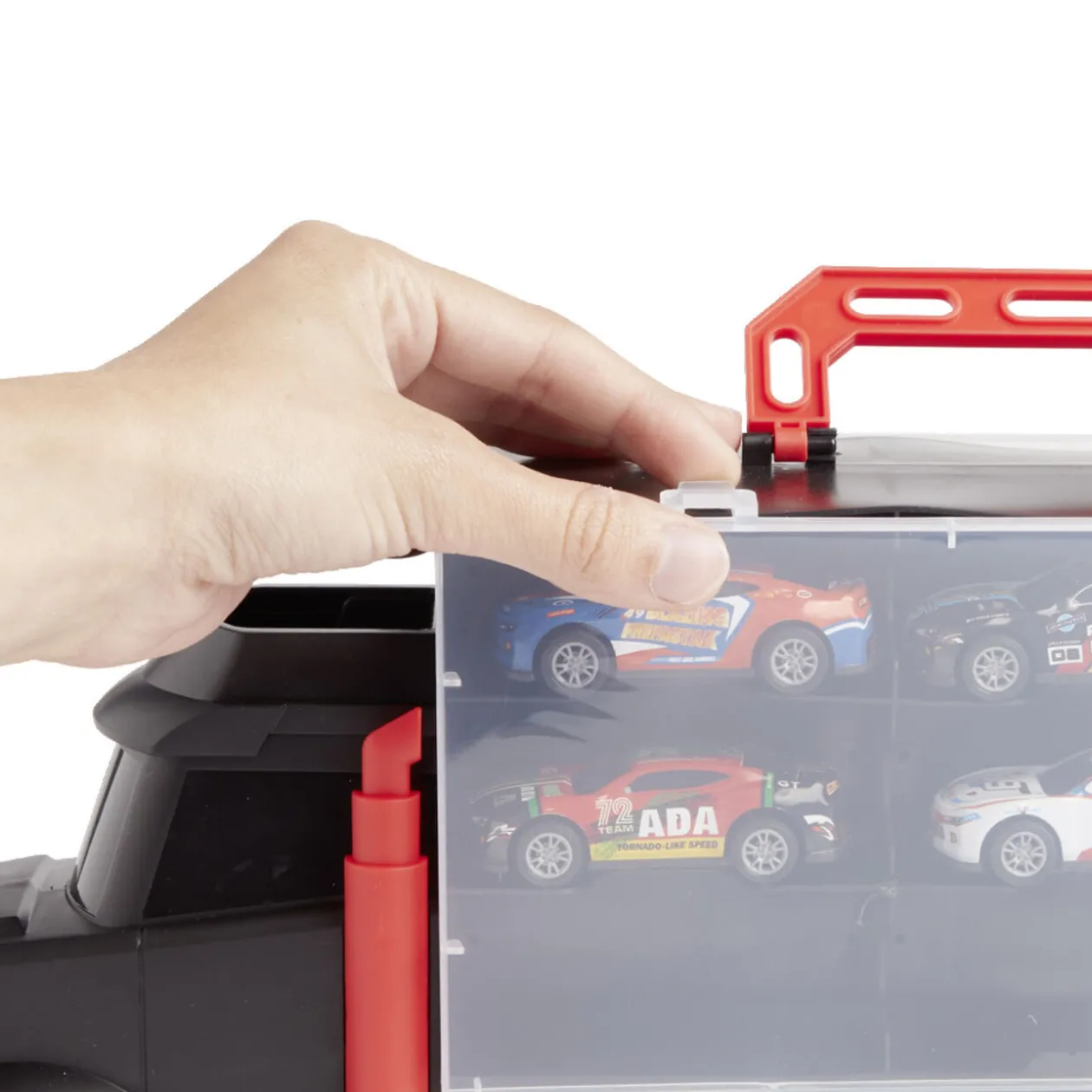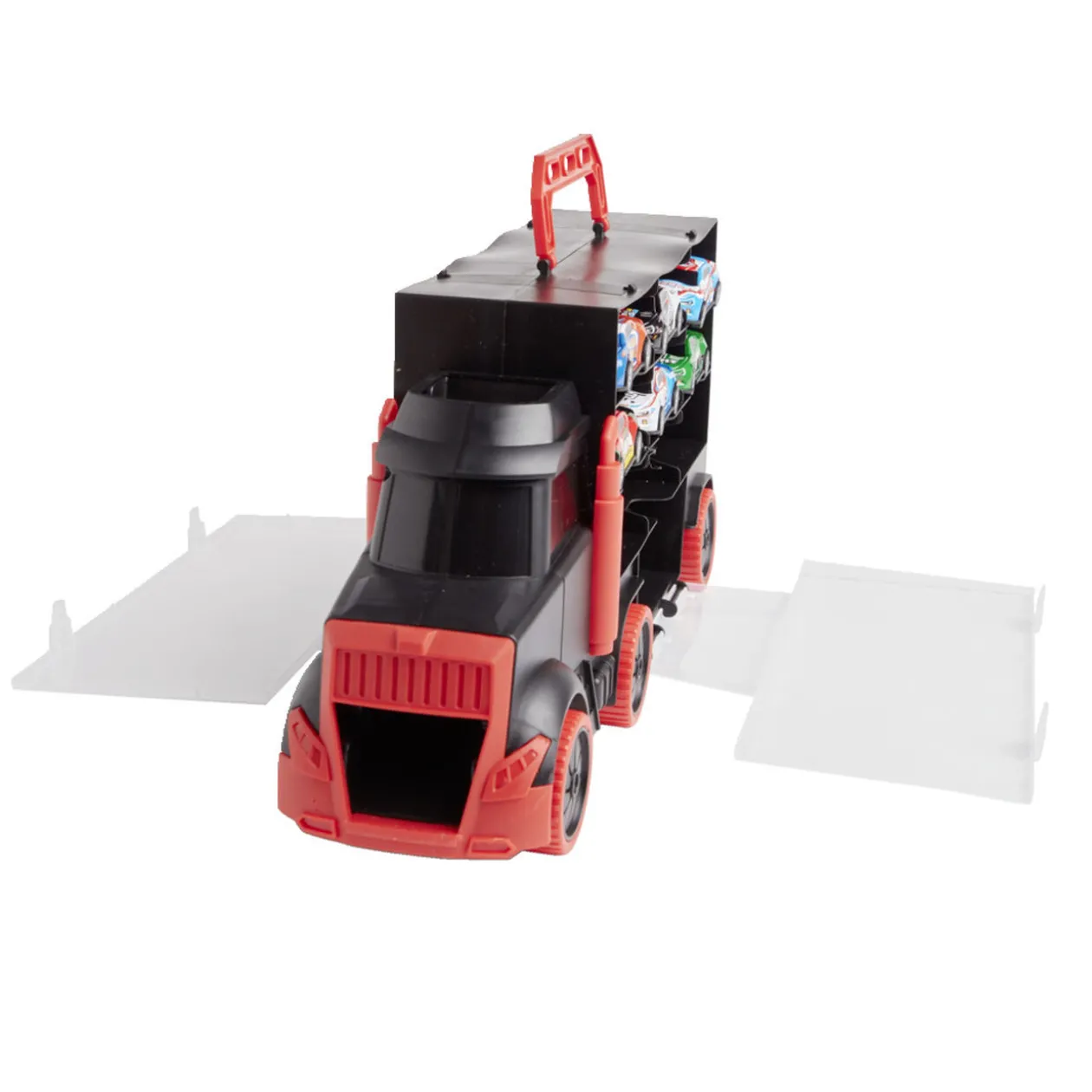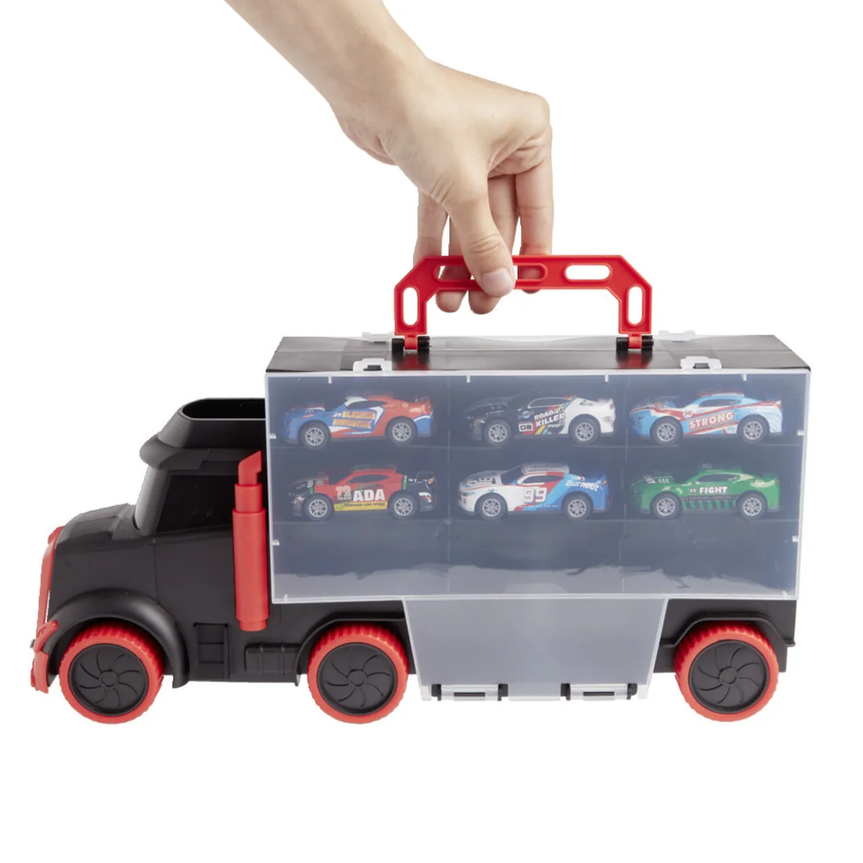 Ce camion de transport accompagné de 6 voitures miniatures est parfait pour des heures de jeu et d’organisation.