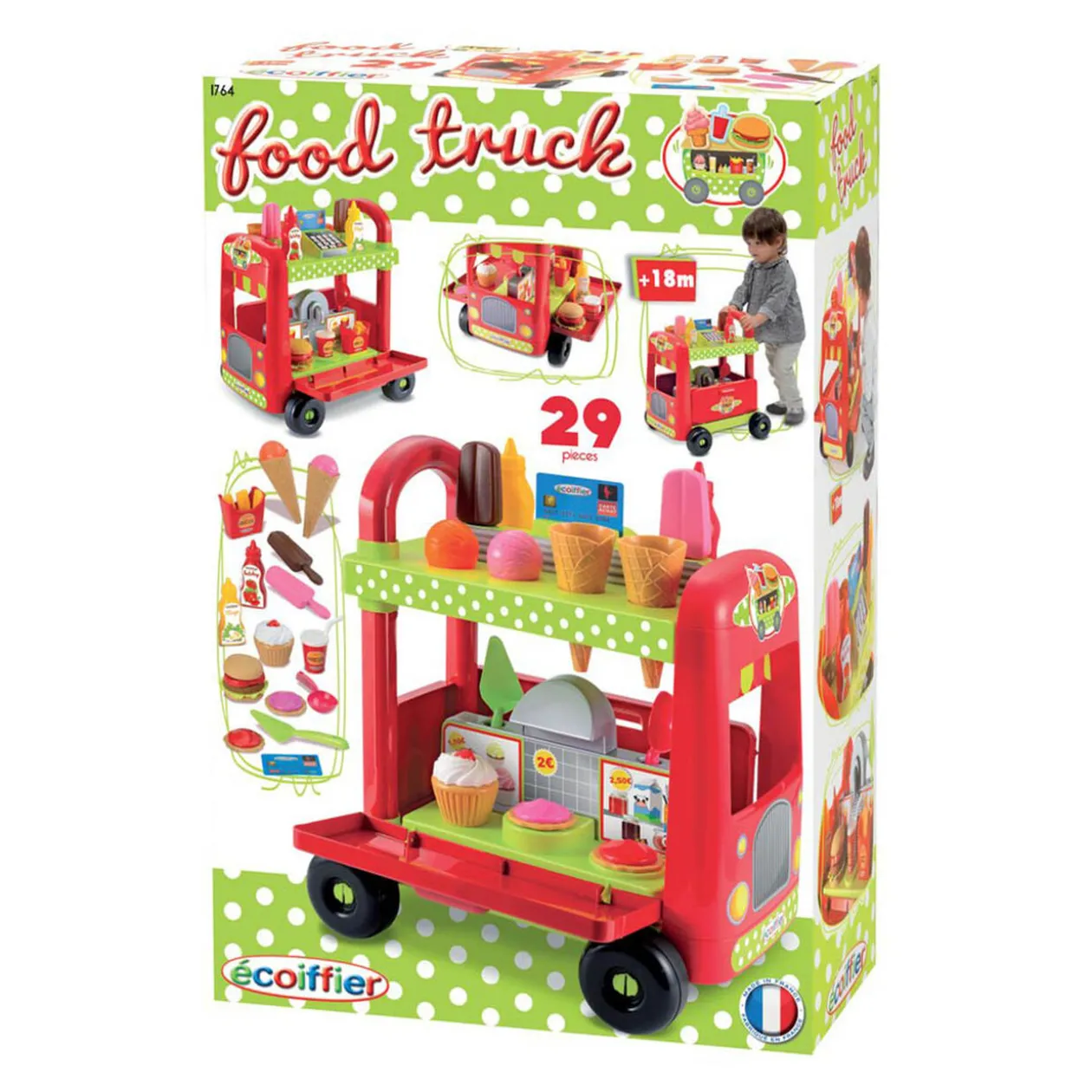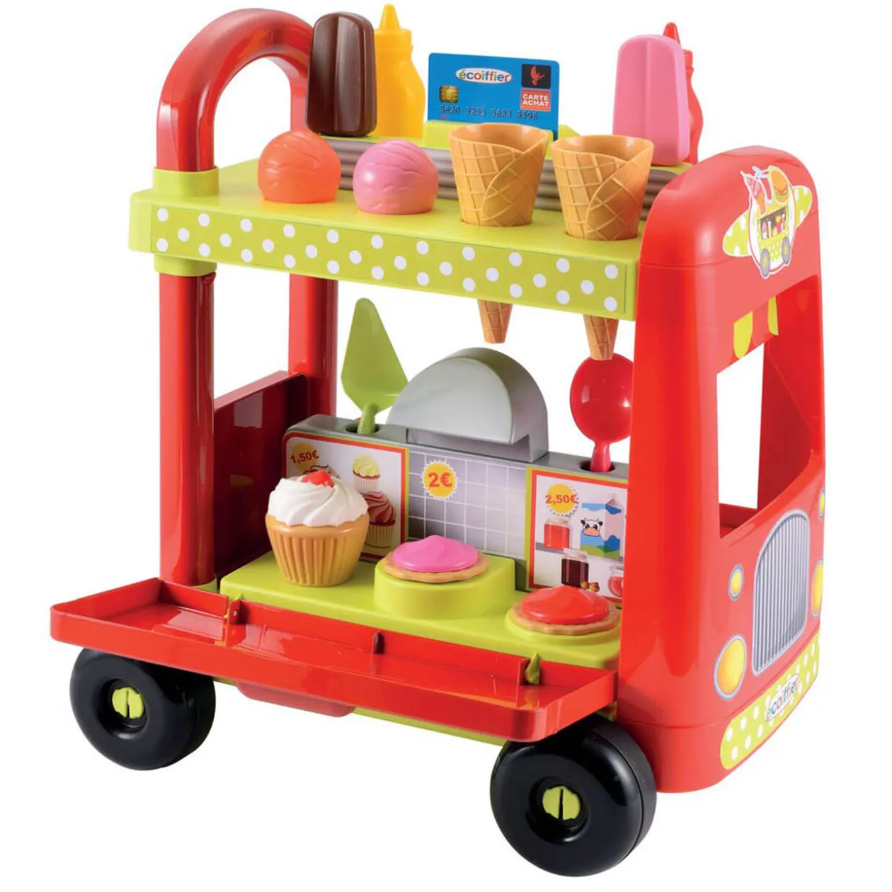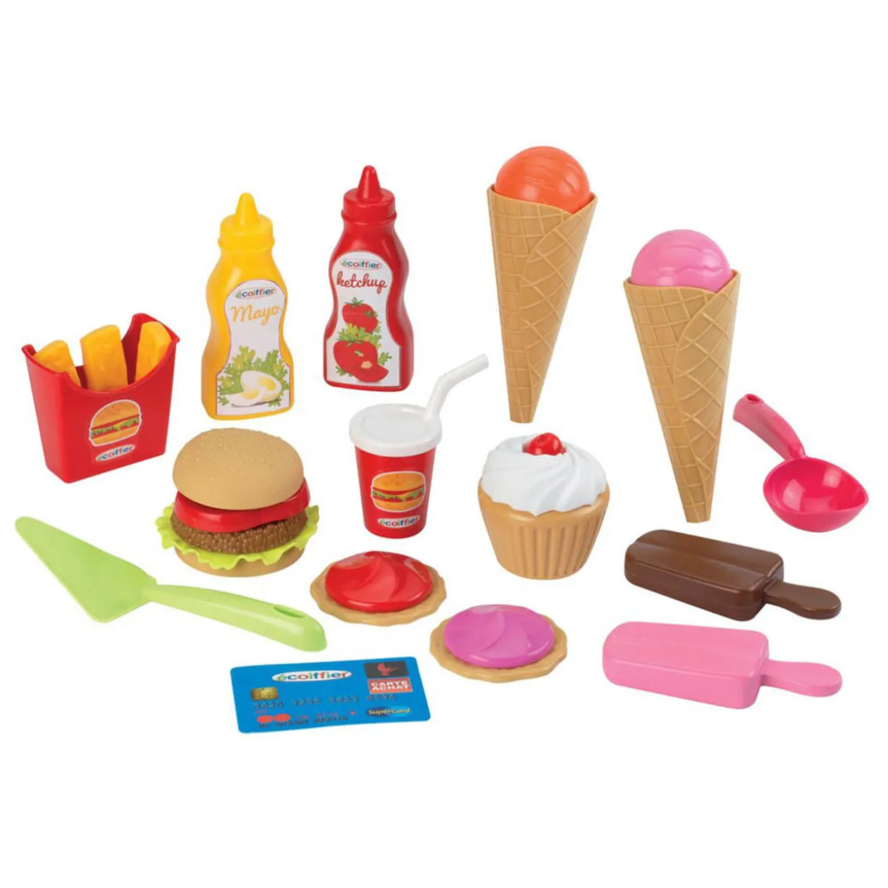 Avec ce chariot, votre enfant aura de quoi faire des ventes en emporter ! Ketchup, mayonnaise, hamburger, frite, glace, crêpe, cupcake, boisson, et même une carte bancaire sont inclus dans ce coffret, tous les éléments nécessaires pour simuler des ventes gourmandes !