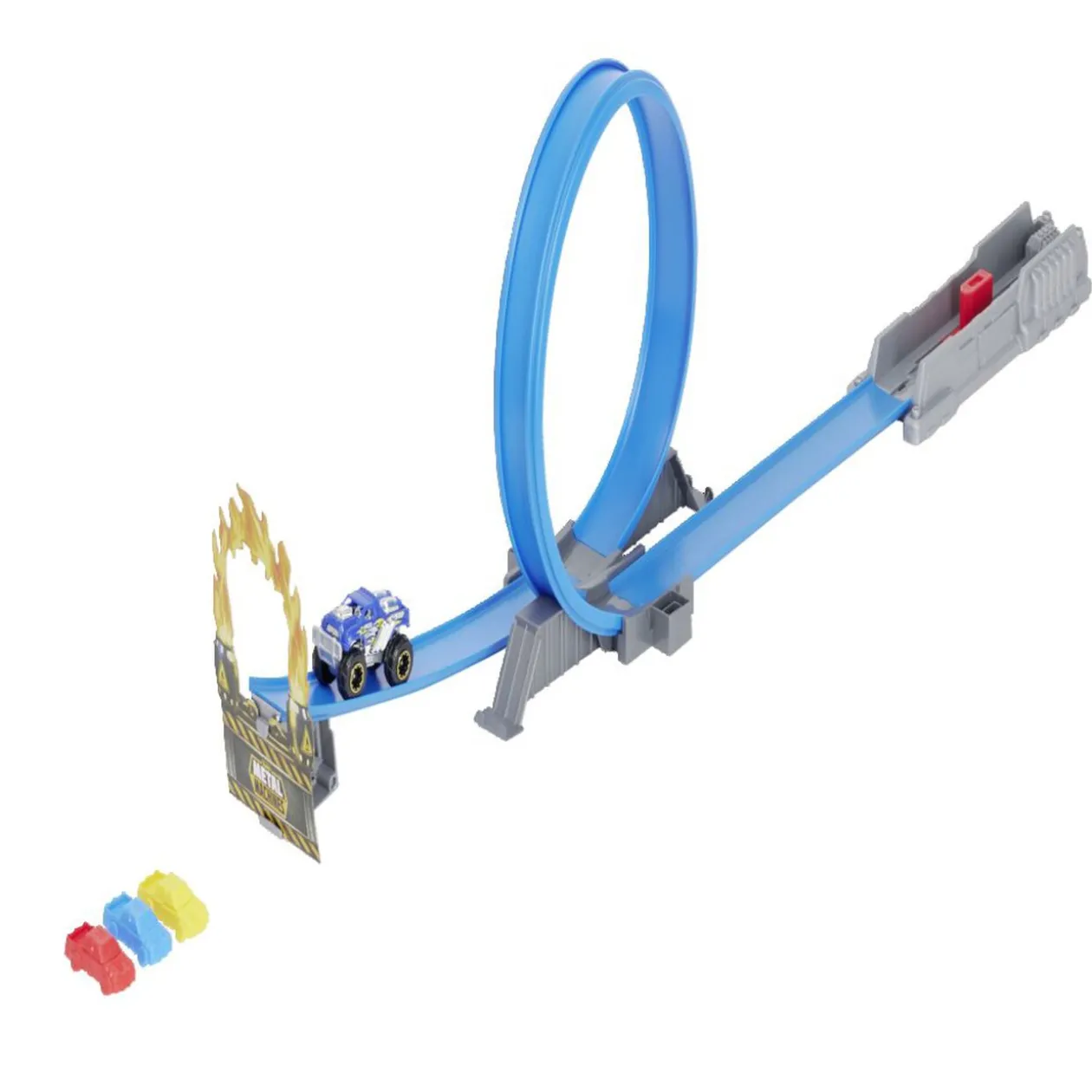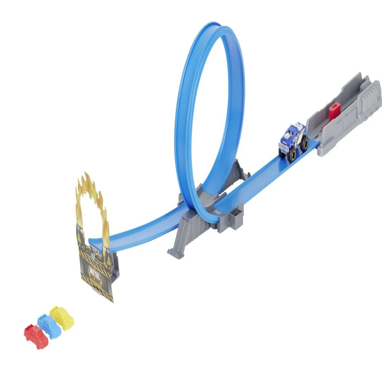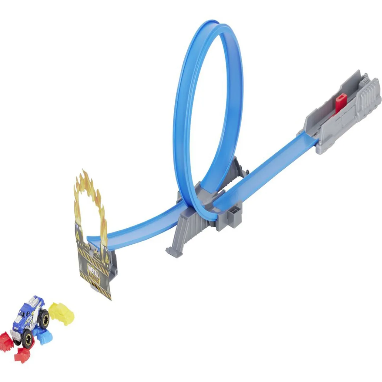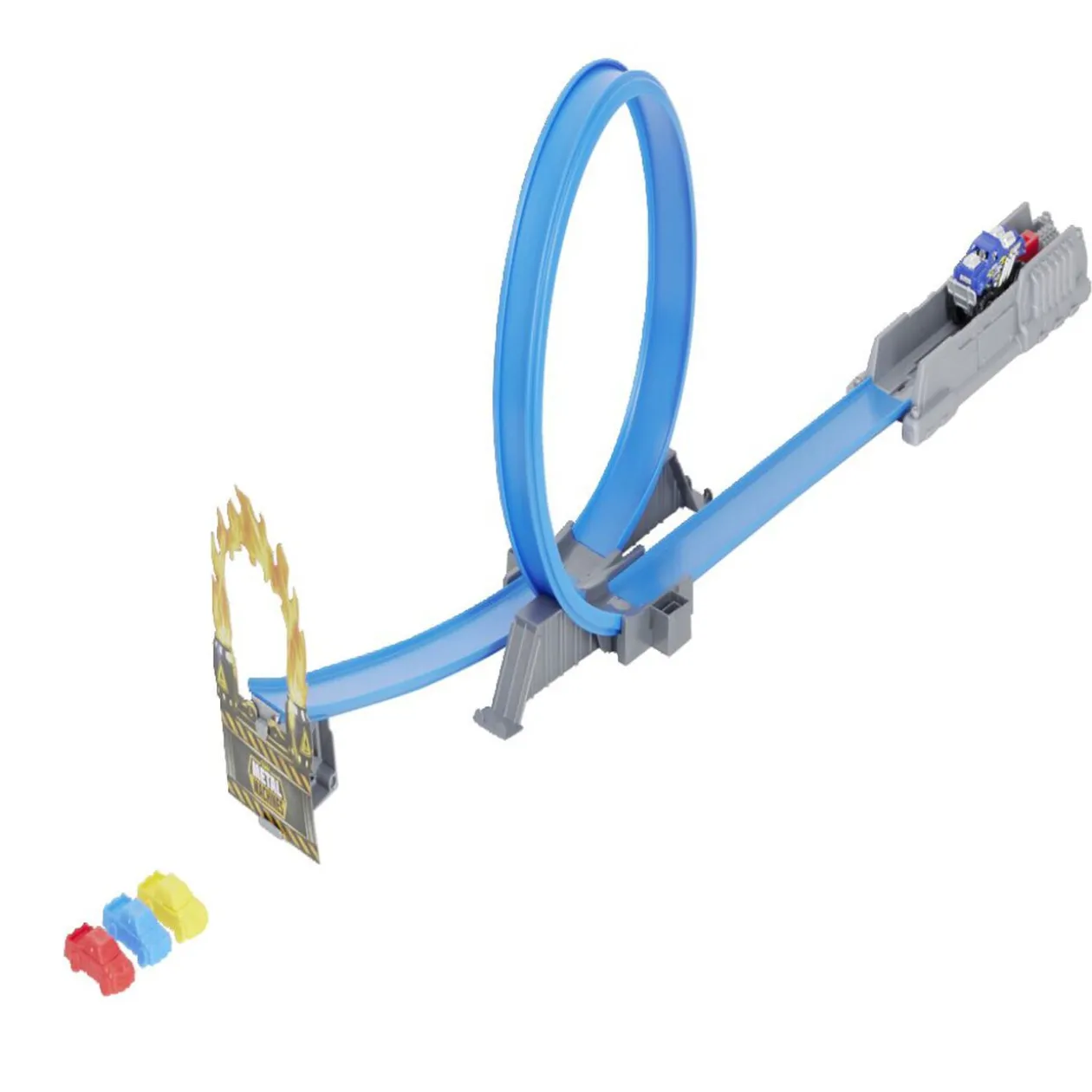 Ce circuit looping Zuru Metal Machines est livré avec 3 mini-voitures et 1 véhicule Bone Crusher .