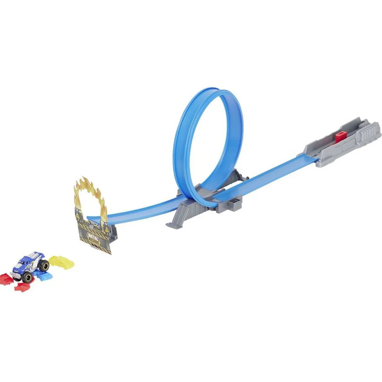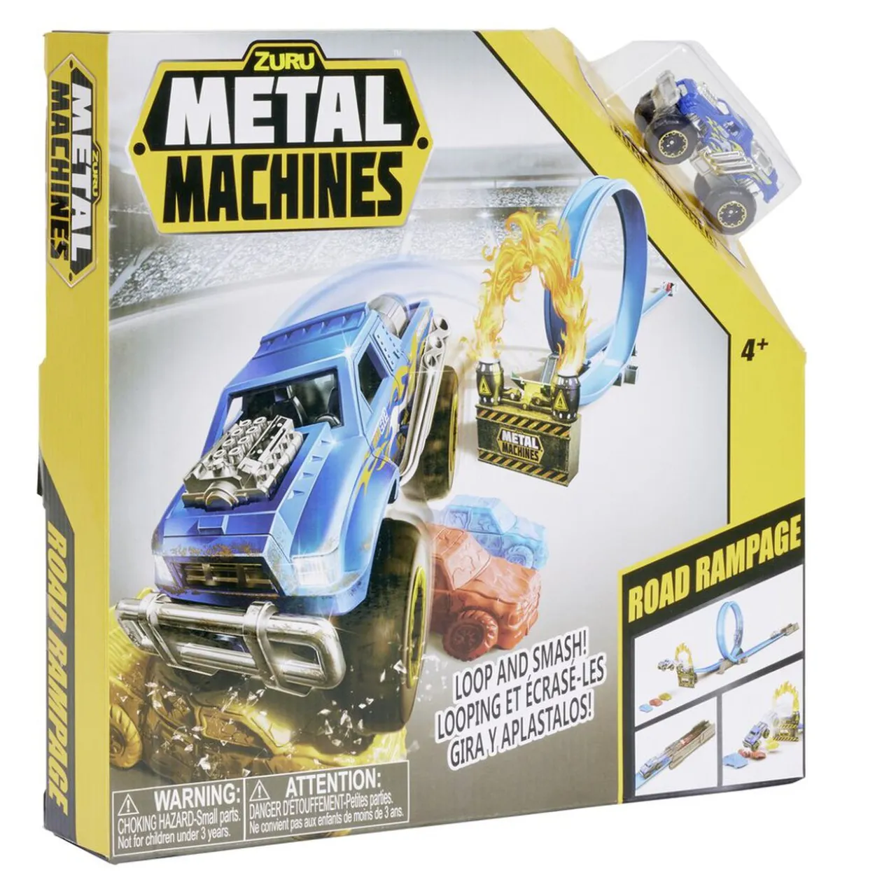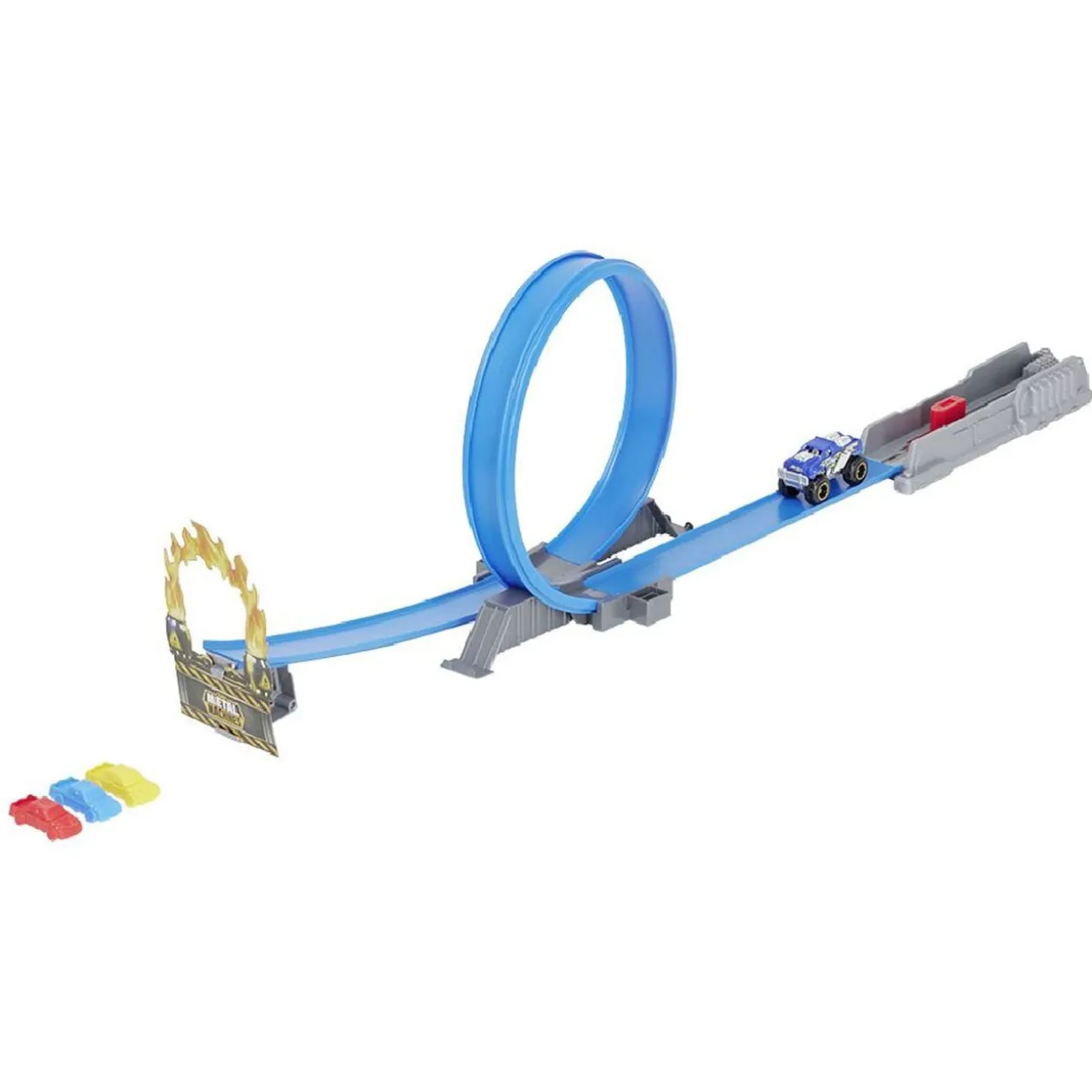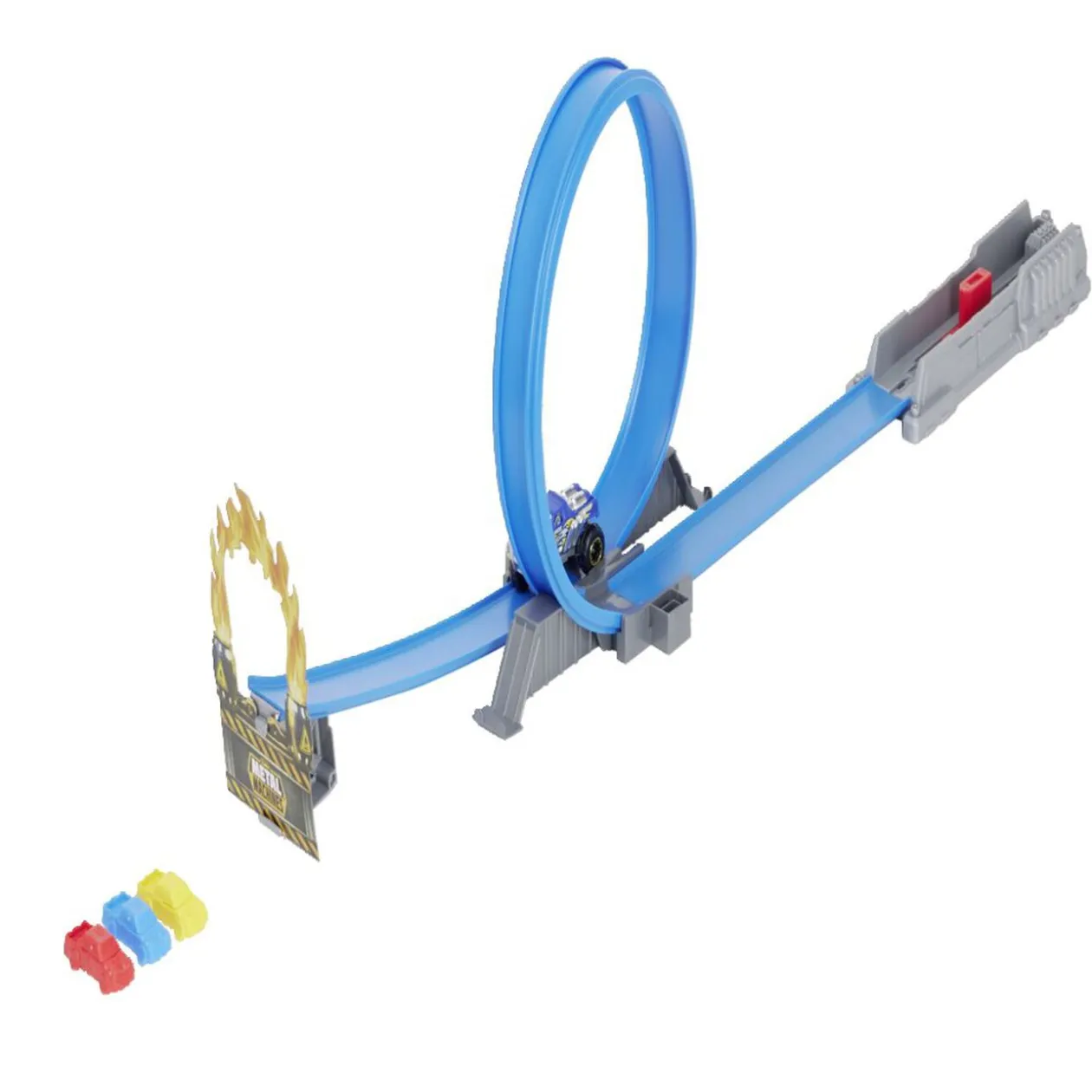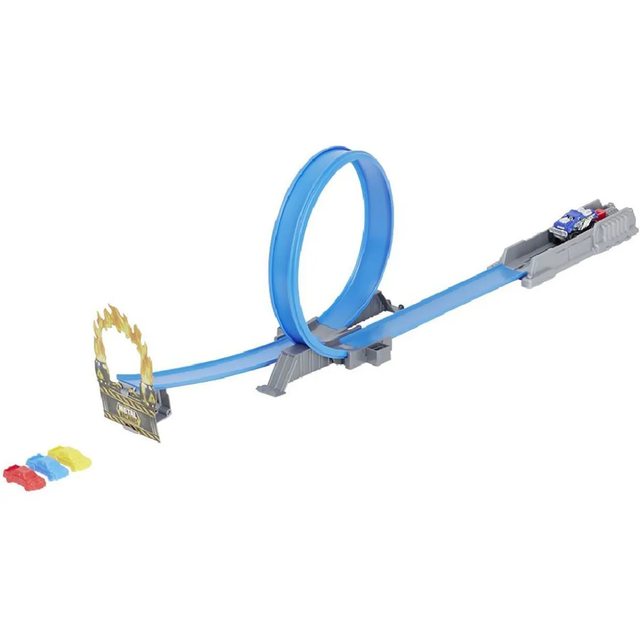 Ce circuit looping Zuru Metal Machines est livré avec 3 mini-voitures et 1 véhicule Bone Crusher .