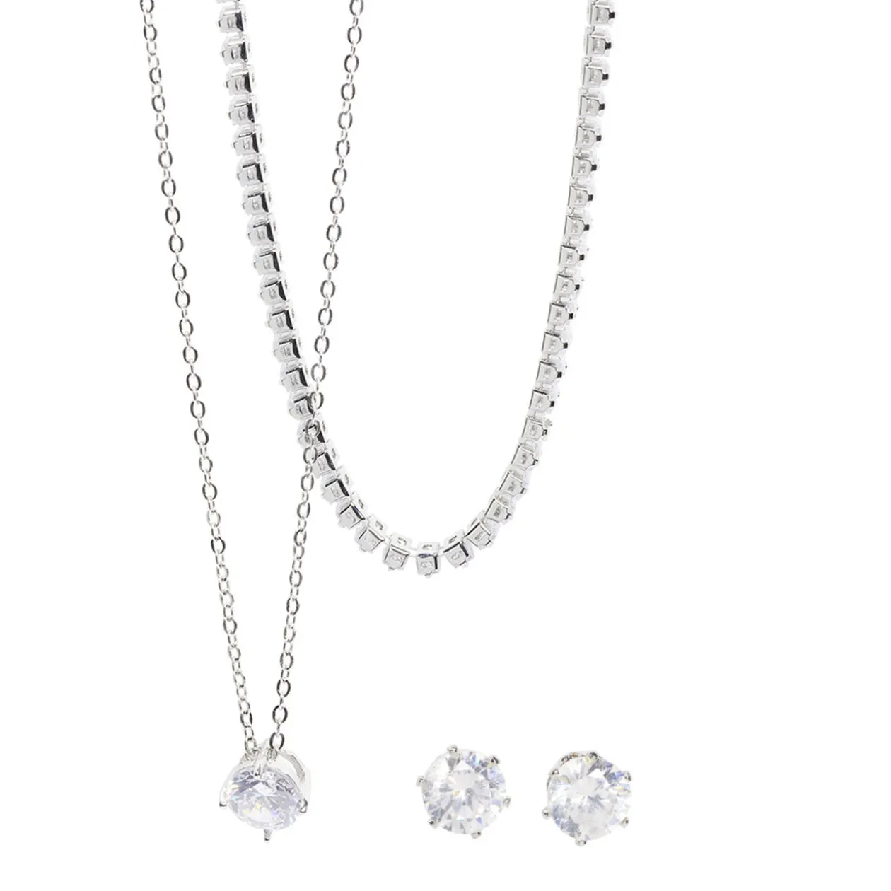 Parure de bijoux de couleur argenté avec strass comprenant 1 collier, 1 bracelet et 1 paire de boucles d’oreilles. Parfait pour sublimer une tenue de soirée !
