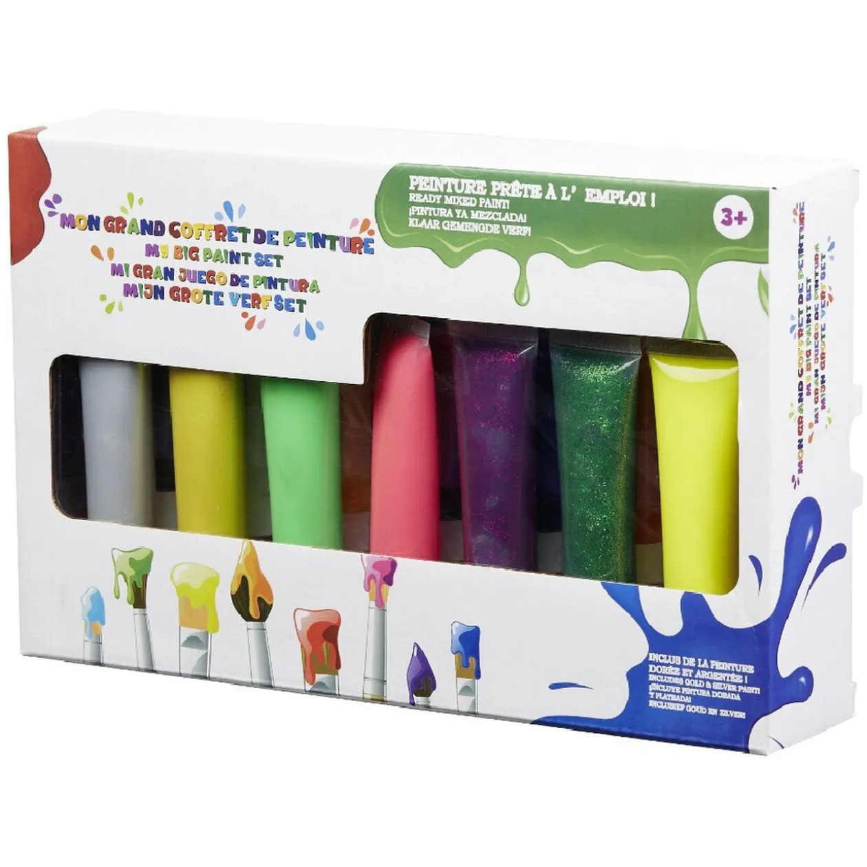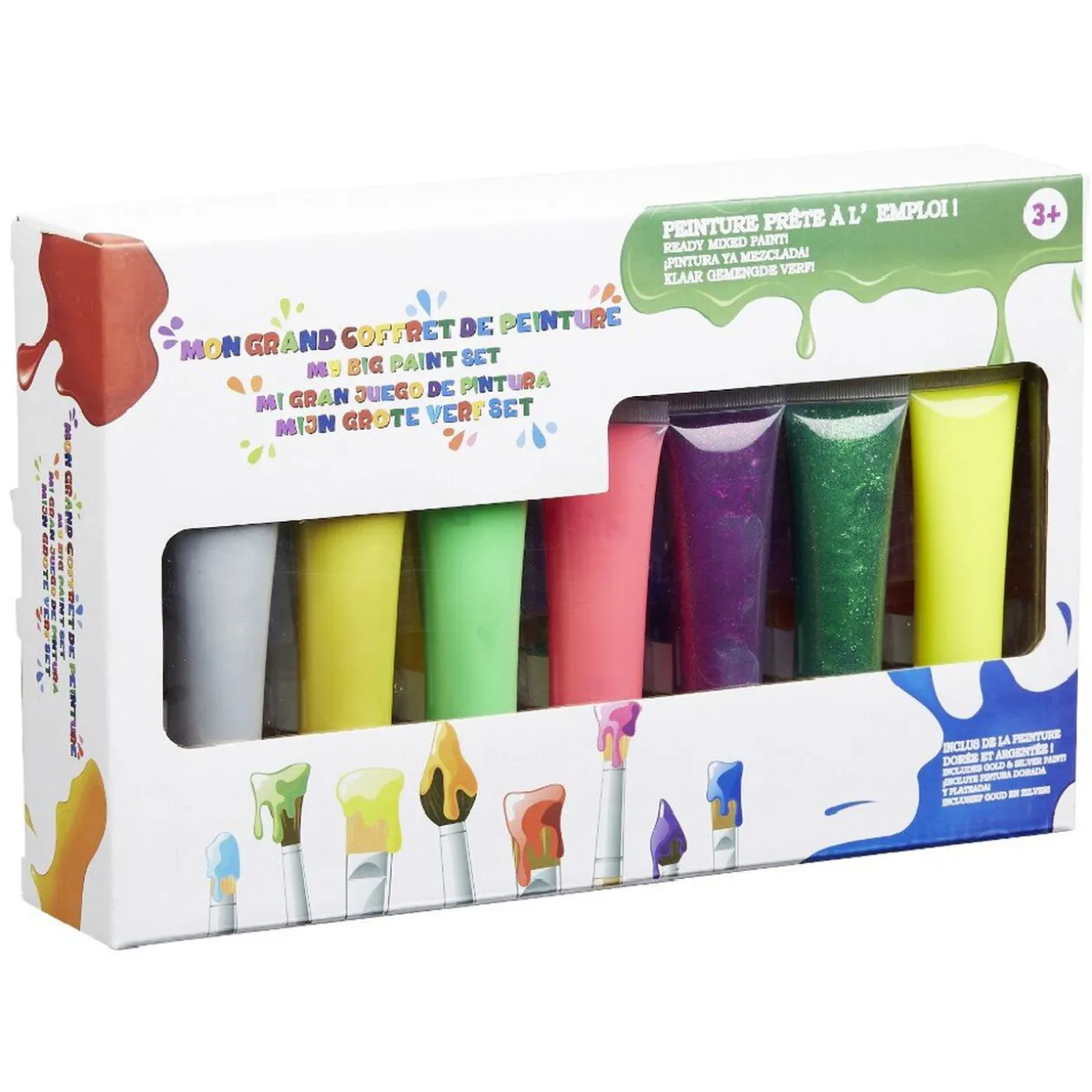 Révélez votre côté artistique avec ce set de peinture prête à l’emploi composé de 14 tubes de couleurs lisses et pailletées.