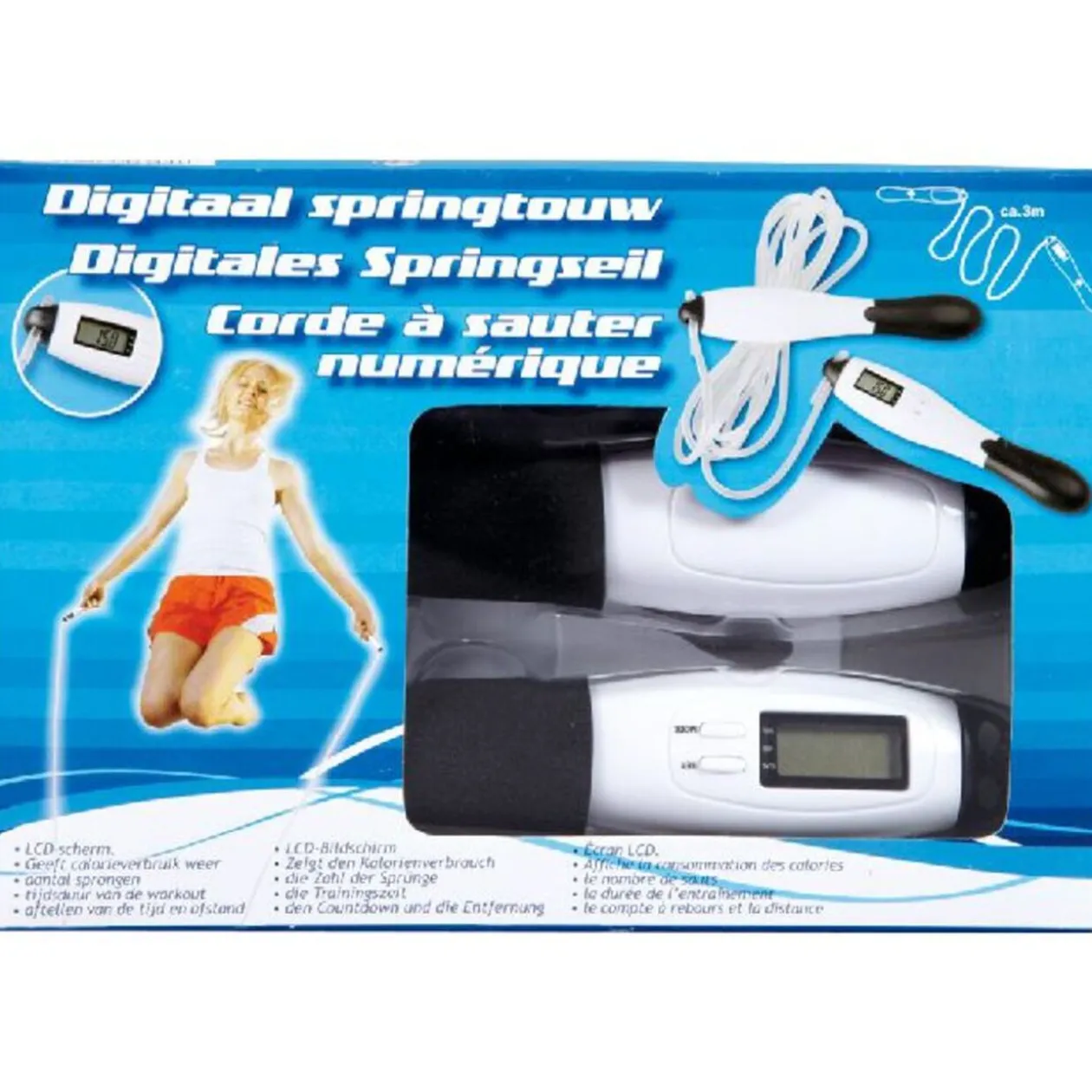 Corde à sauter numérique, écran LCD, affiche la consommation des calories, le nombre de sauts, la durée de l’entraînement, le compte à rebours et la distance, fonctionne avec 1 pile AG13 fournie…