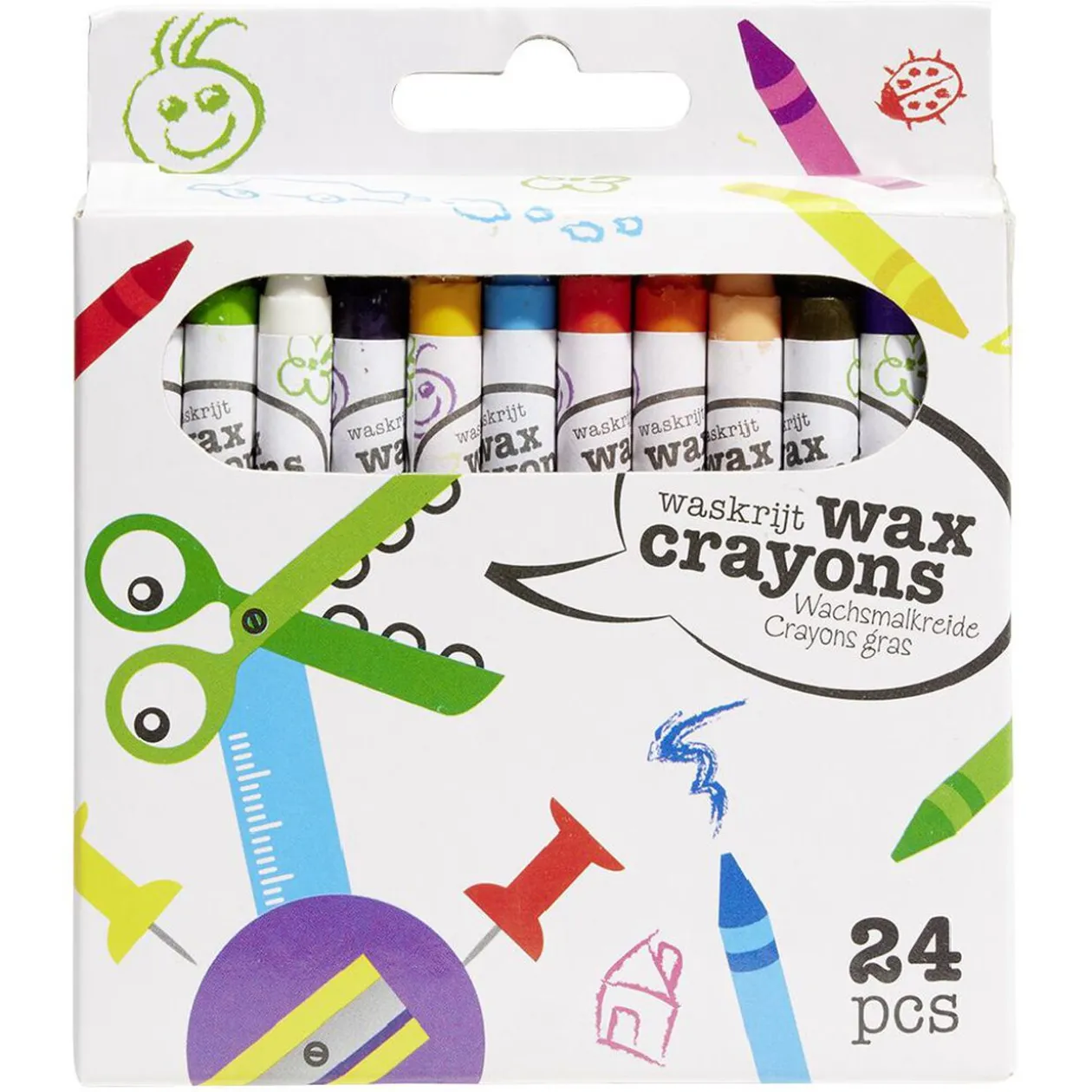 Boîte de 24 crayons gras de toutes les couleurs.