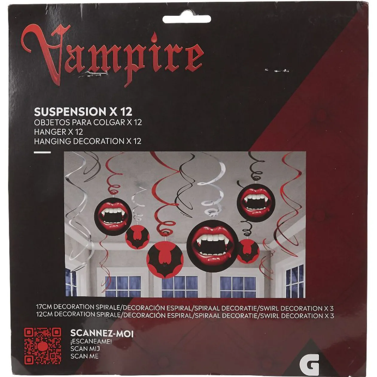 12 suspensions pour décoration d’Halloween : des bouches de vampire, des chauve-souris et des spirales.