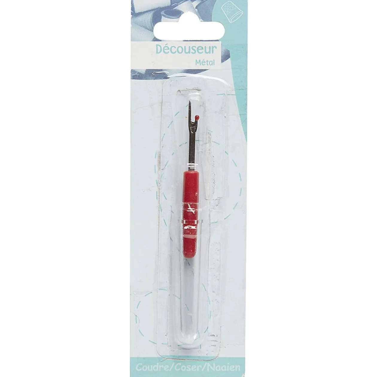 Découseur coupe fil en métal avec manche plastique rouge.