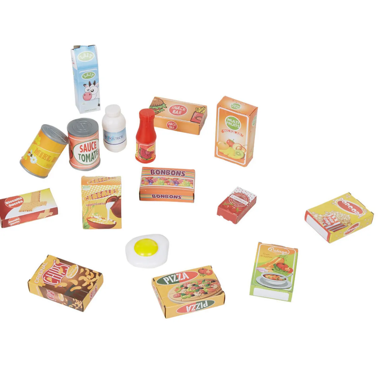 Dinette comprenant 18 pièces de divers aliments du supermarché tels que brique de lait, boîte de céréales, boîte à pizza, gâteaux, céréales, chips, conserve …