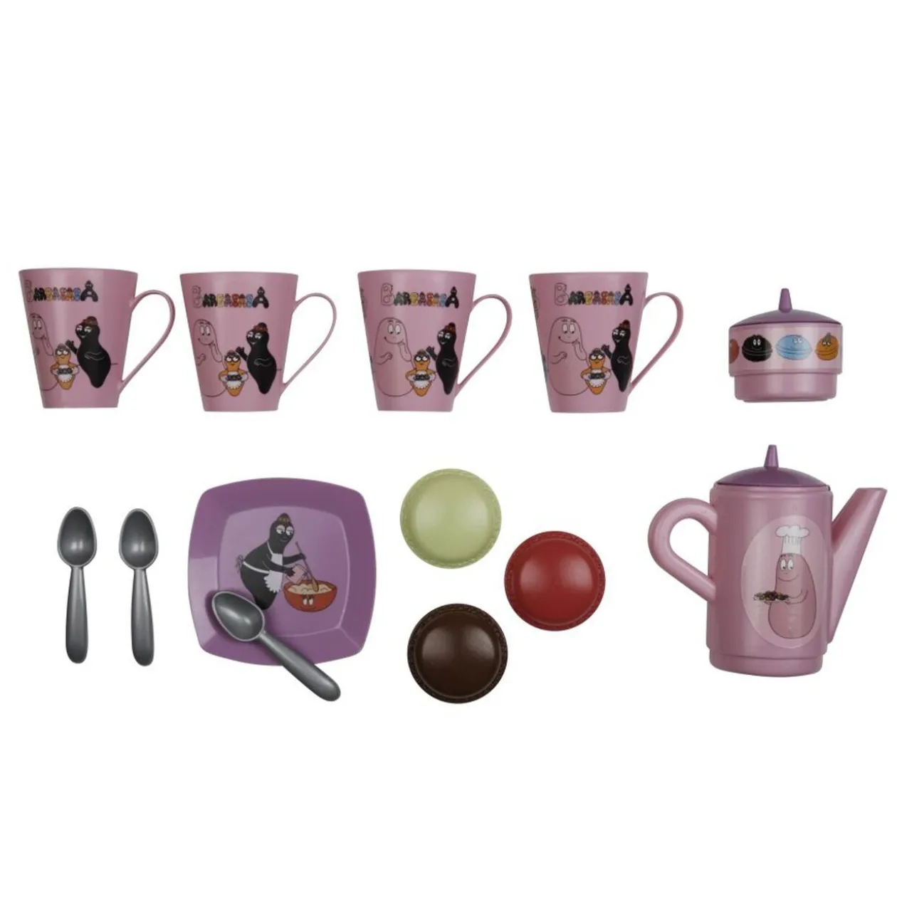 Dinette Barbapapa en plastique. Existe en modèle repas avec assiettes (18 pièces) ou en modèle café avec tasses (16 pièces).