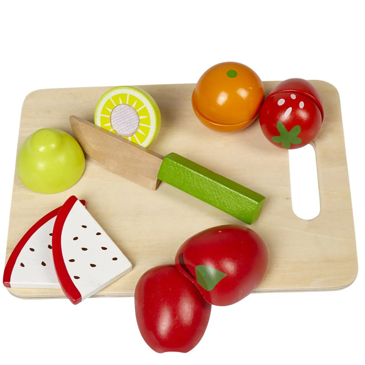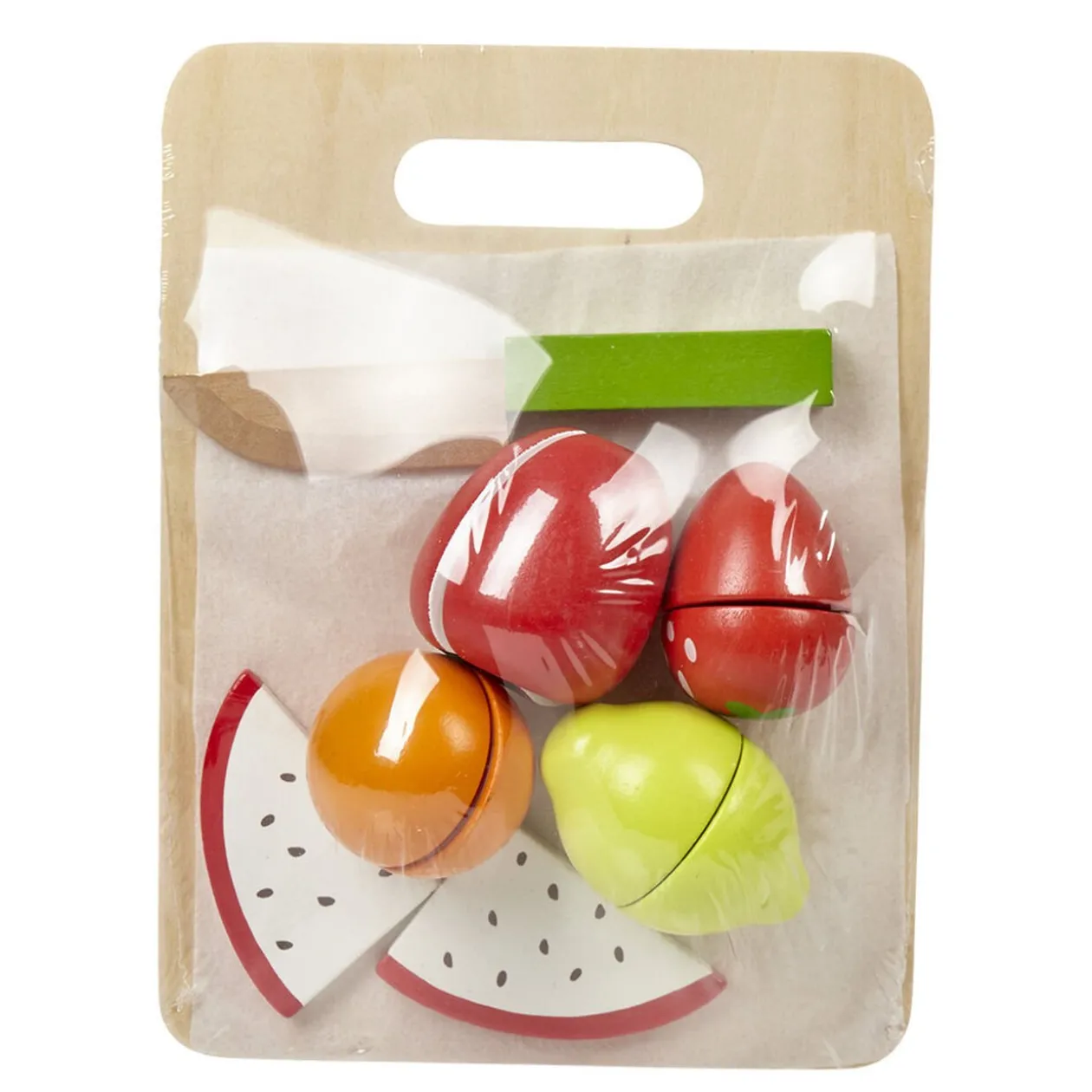 Dinette en bois 8 pièces comprenant 1 planche à découper dim. 20×15 cm, 1 couteau, 1 pomme, 1 fraise, 1 orange, 1 citron et des tranches de pastèque.