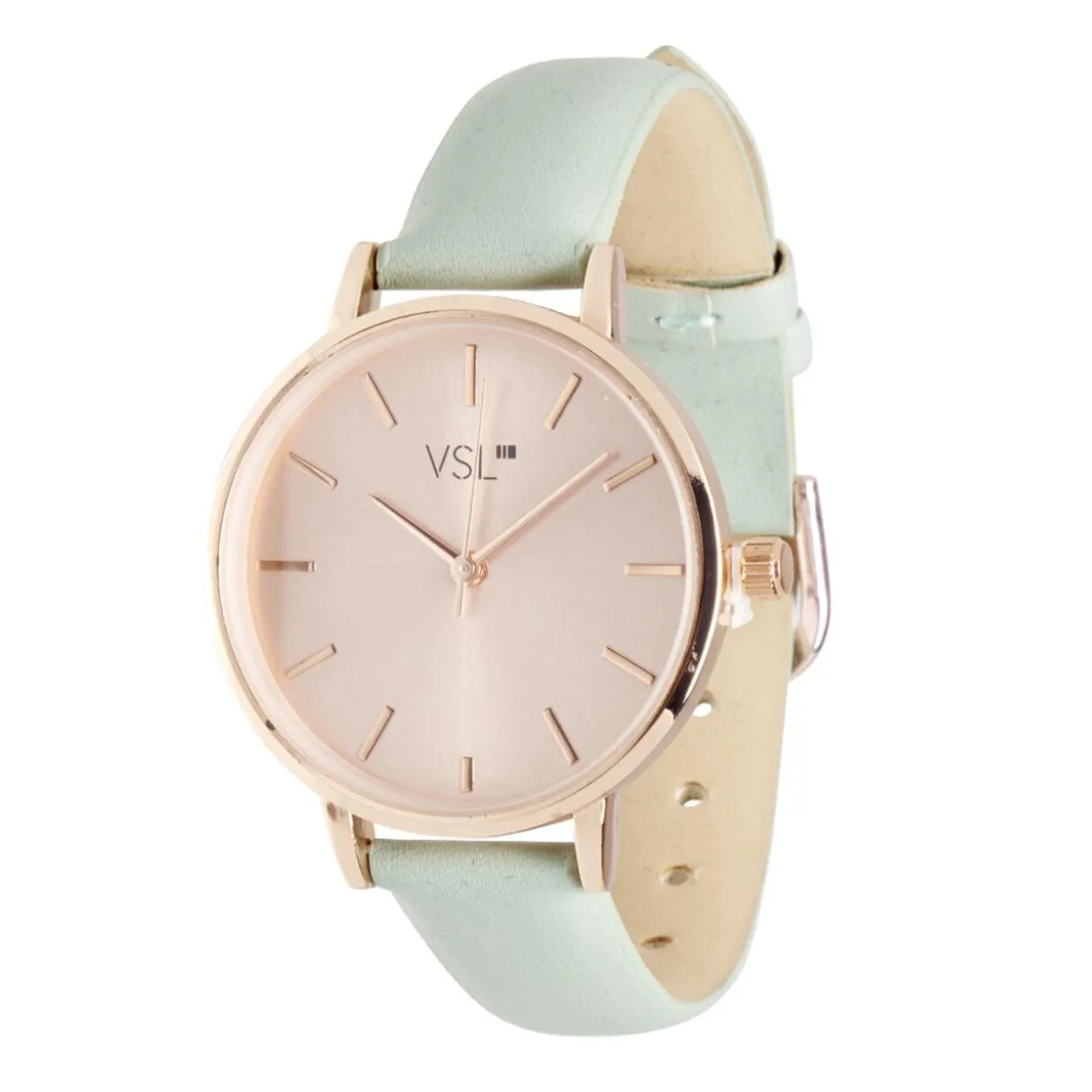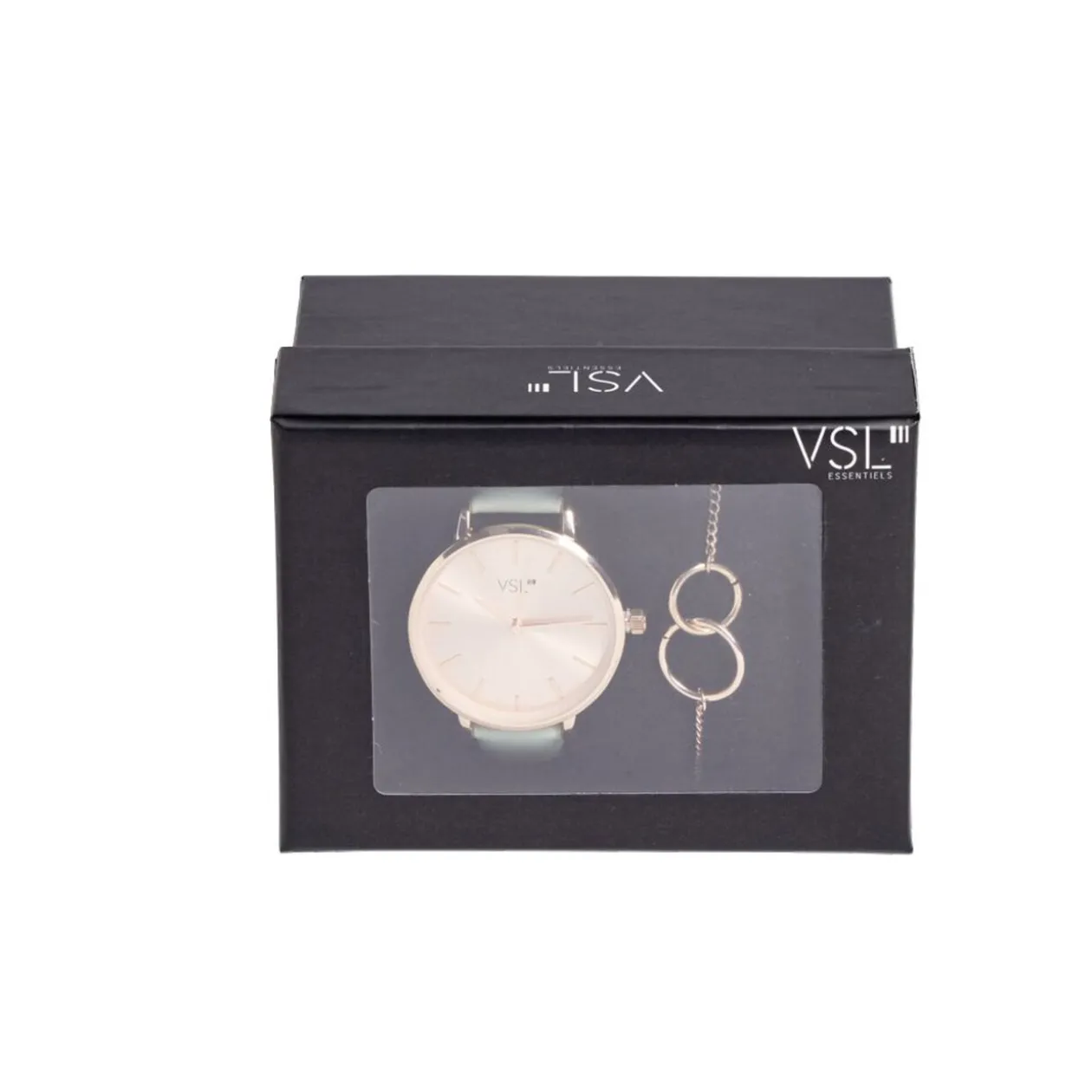 Cet ensemble pour femme se compose d’une montre doté d’un bracelet vert pastel et d’un cadran rond rose gold avec un bracelet en métal agrémenté de deux petits anneaux qui s’entremêlent.