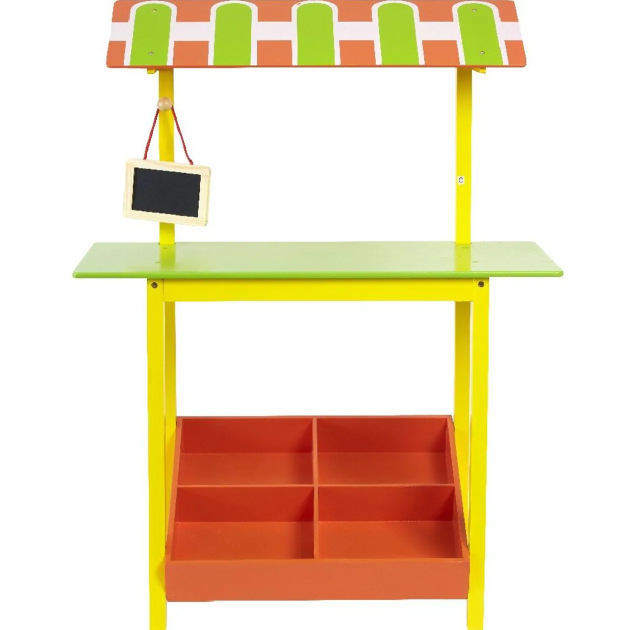 Etale de marchand en bois comprenant un petite ardoise. Dim : 60 x 30 x 79 cm . Dès 2 ans