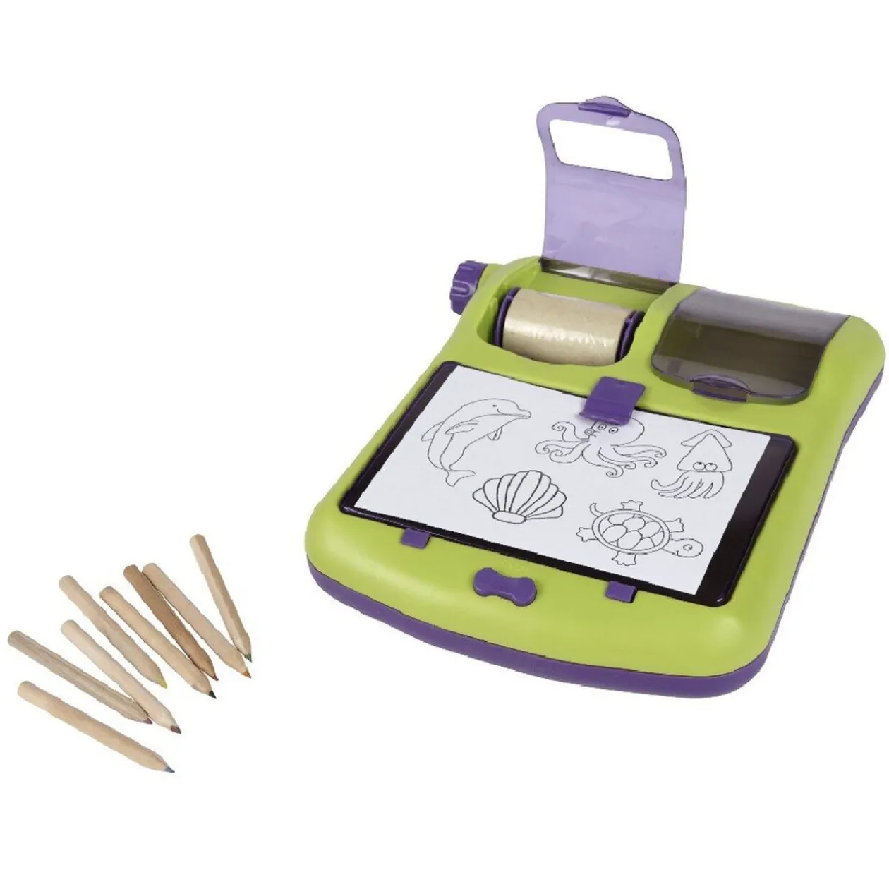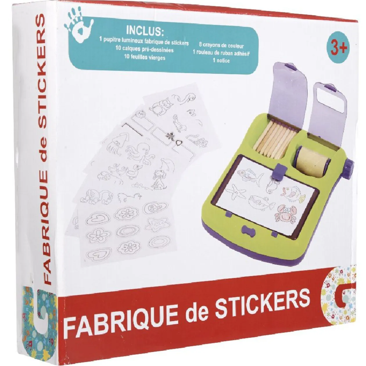 Kit pour fabriquer des stickers comprenant : 1 pupitre lumineux fabrique de stickers, 10 calques pré-dessinés, 10 feuilles vierges, 8 crayons de couleur, 1 rouleau de ruban adhésif et 1 notice.