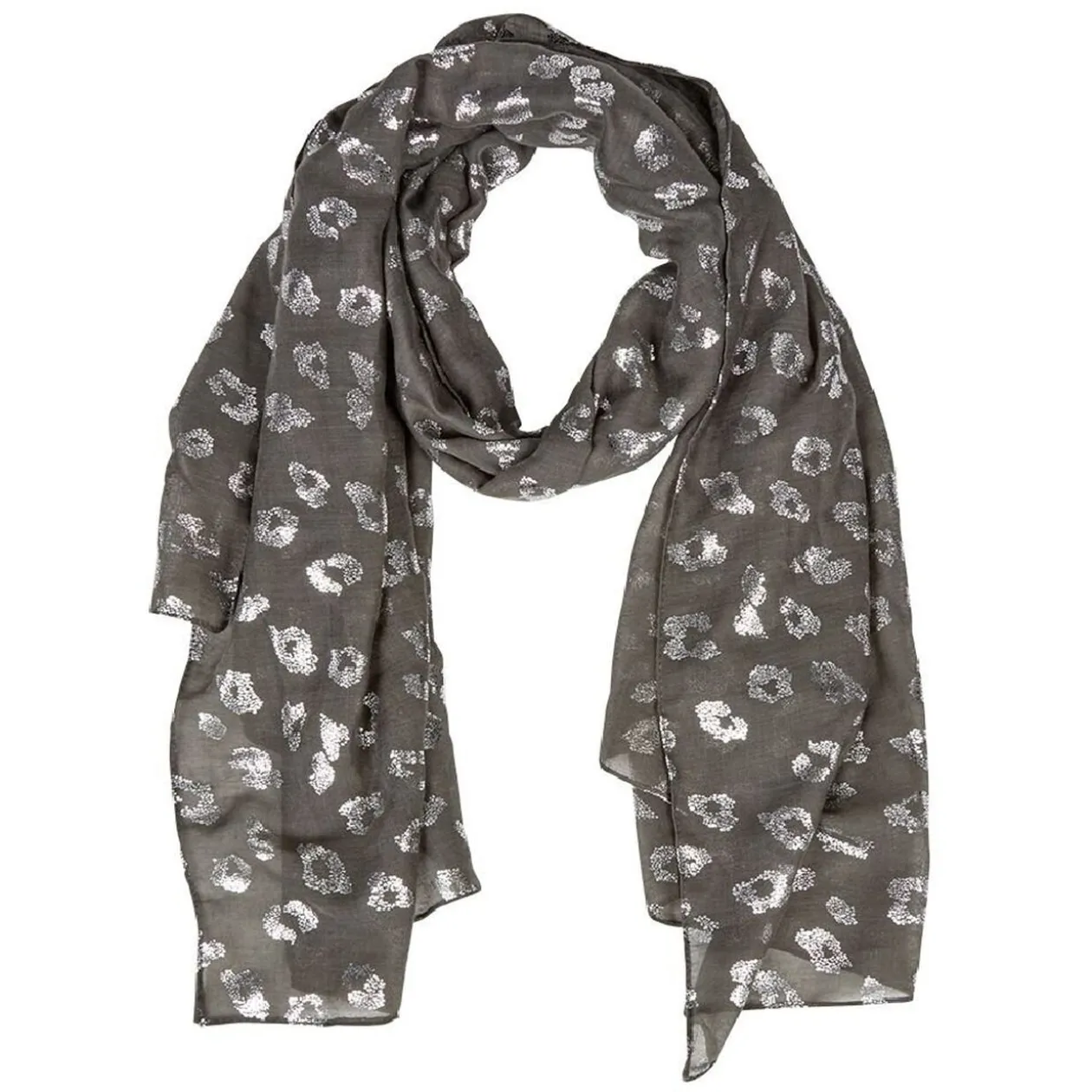 Foulard en polyester plissé à motif léopard gris et argenté.
