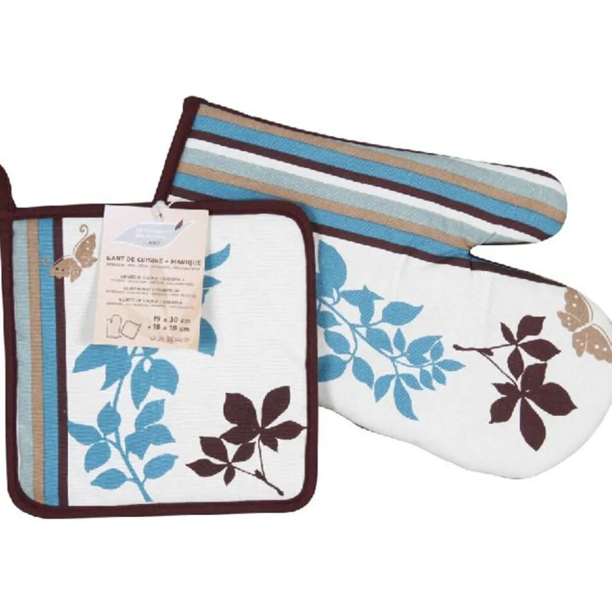 Gant et manique 50% coton, 50% polyester. Dimension du gant : 19 x 30 cm. Dimension de la manique 18 x 18 cm.