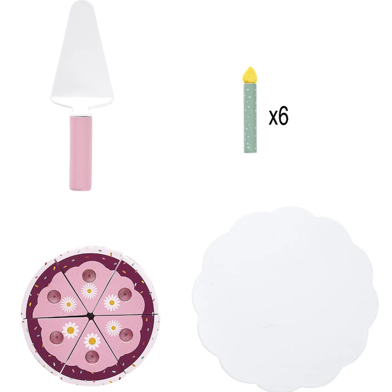 Gâteau d’anniversaire en bois pré-découpé en 6 parts pour recréer la fête et le partage.