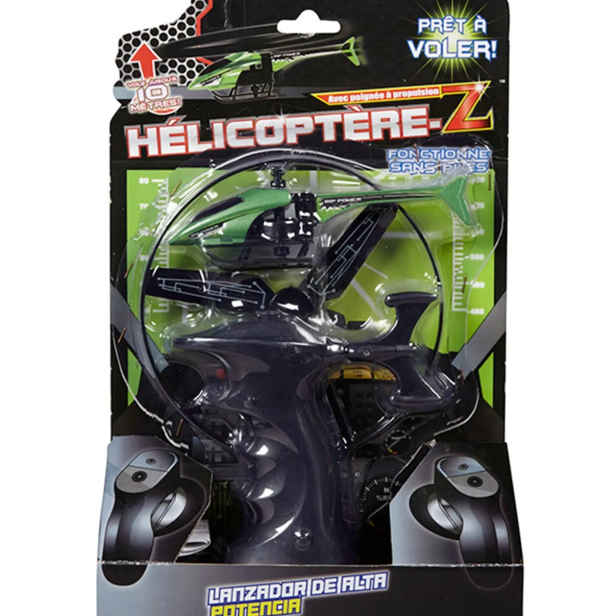 Hélicoptère hélice avec système de lance disque et support toupie. Longueur 15 cm. Existe en rouge, bleu et vert. Hélicoptère et manche L17X16D15 cm. Peut voler jusqu’à 9 mètres de haut ! Dès 5 ans.