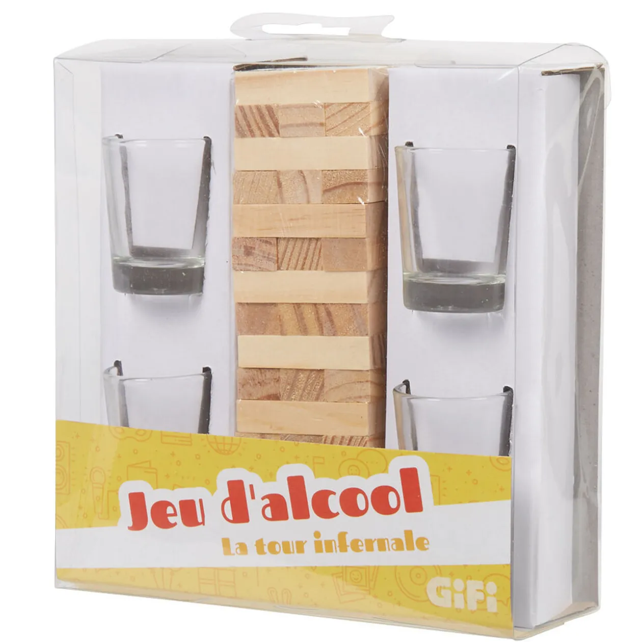 Jeu de boisson la tour infernale comprenant une tour de briques en bois et 4 verres.