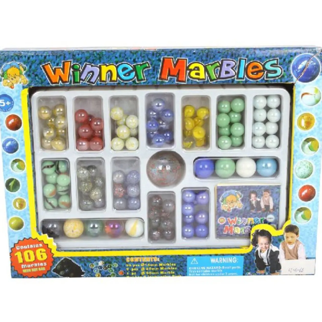 Jeu de billes comprenant 96 billes de Ø 16mm, 9 billes de Ø 25mm et 1 bille de Ø 40 mm. Dès 5 ans.