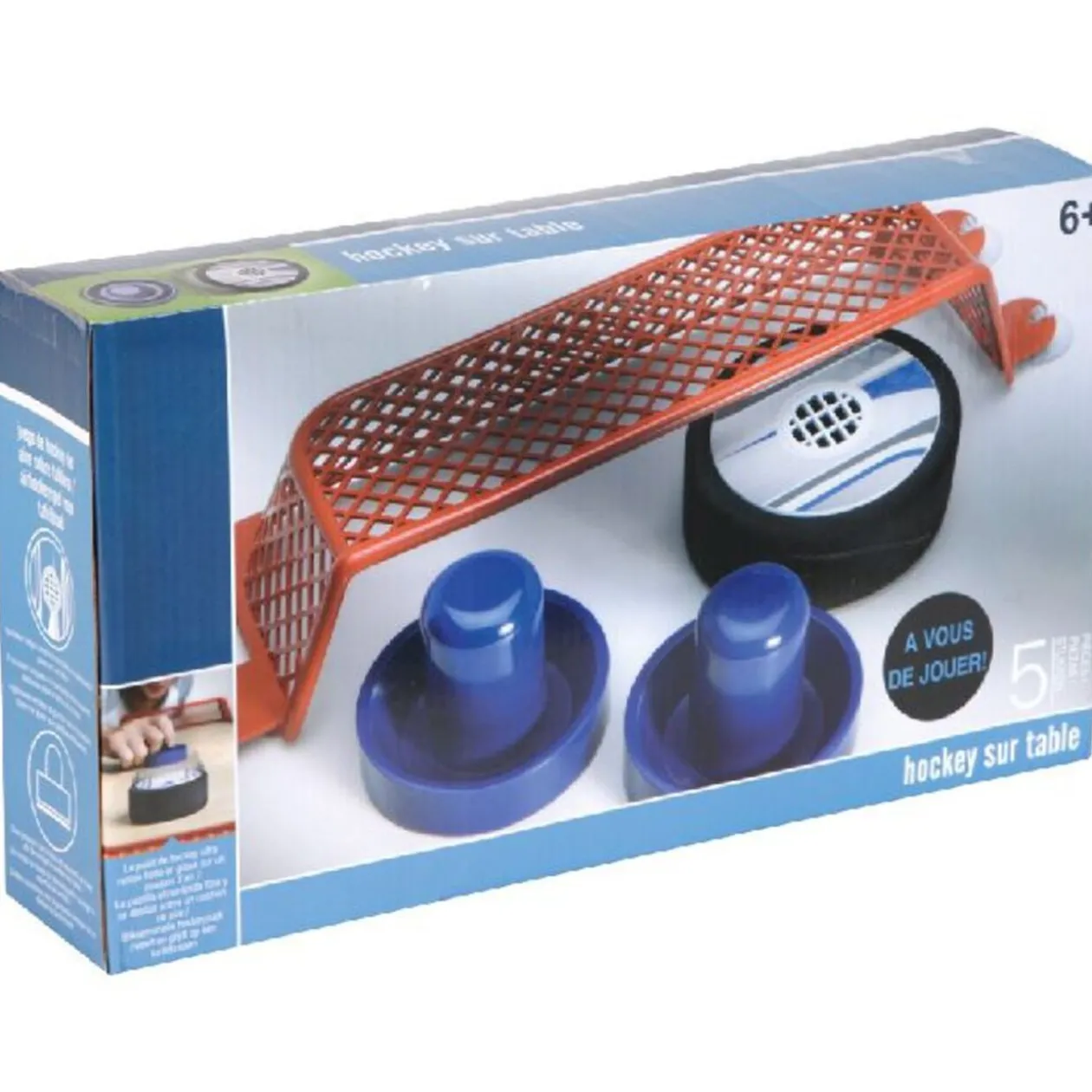 Jeu de air hockey, se fixe sur une table. Fonctionne avec 2 piles LR03 non fournies, dès 6 ans.