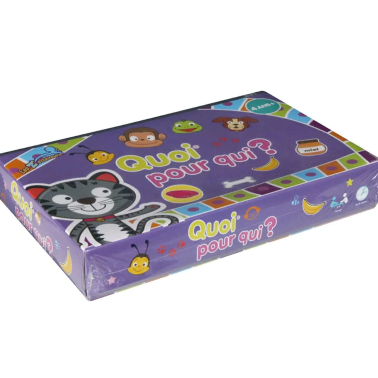 Jeu de société quoi pour qui, dès 4 ans. Pour gagner, le joueur devra remplir la gamelle d’un animal et être le 1er à lui apporter en déjouant les pièges des adversaires.