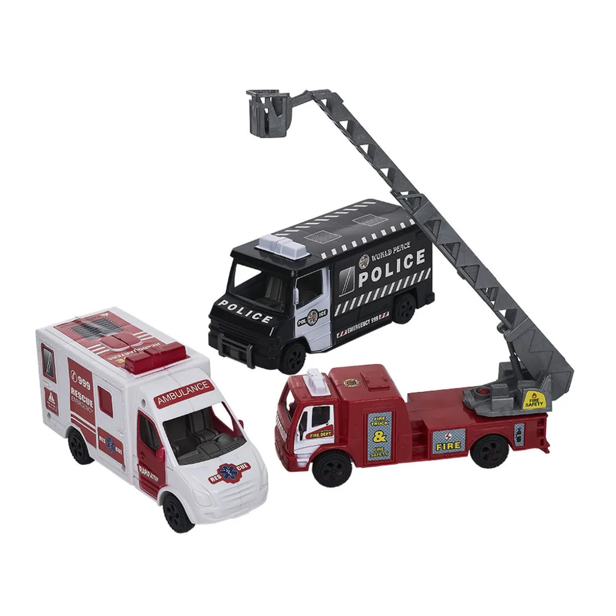 Lot de 3 petites voitures comprenant 1 camion de pompier, 1 ambulance et 1 fourgonnette de police.
