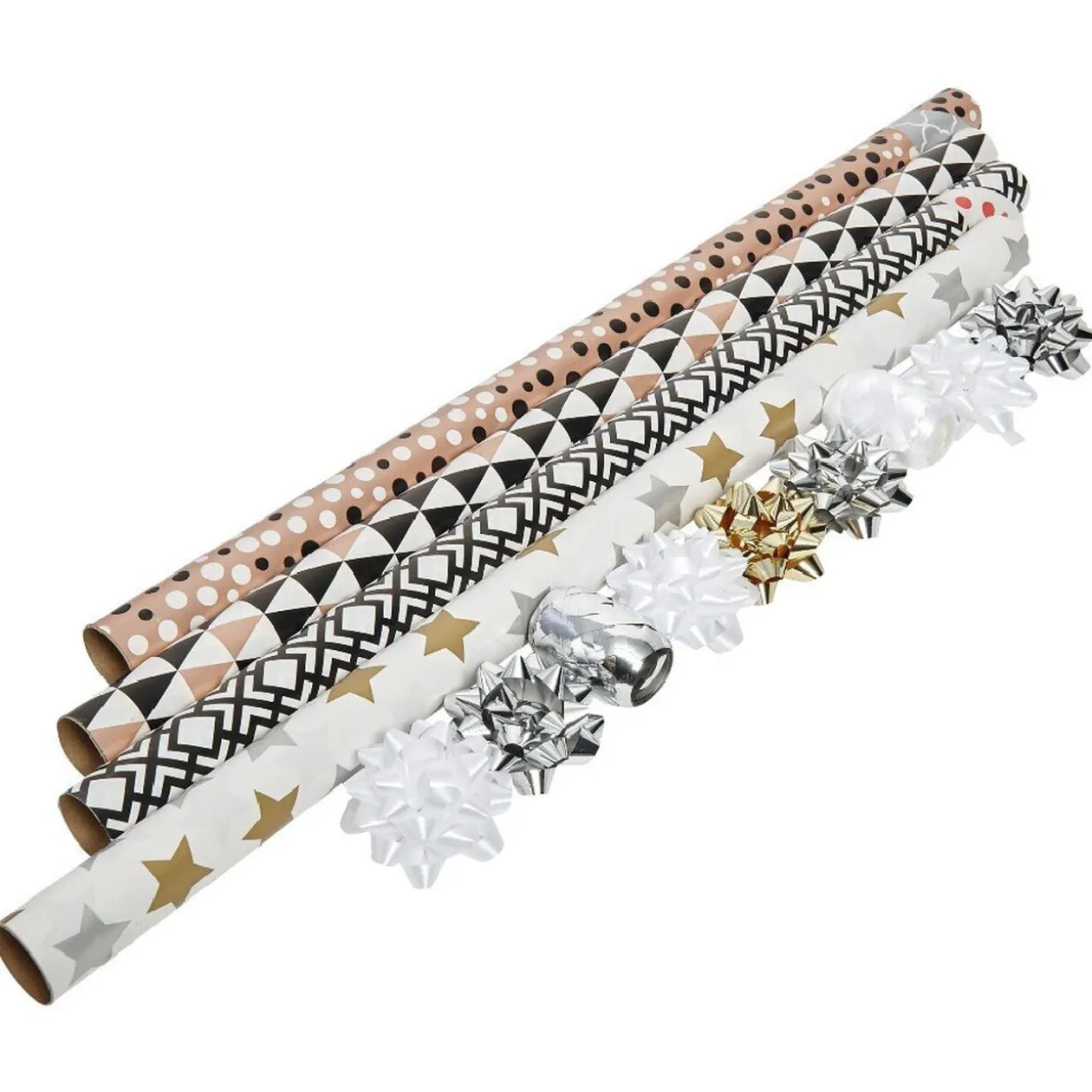 Idéal pour la réalisation de vos paquets cadeaux de Noël, ce kit complet comprend 4 rouleaux de papiers cadeaux de mètres, 2 bolducs et 7 noeuds.