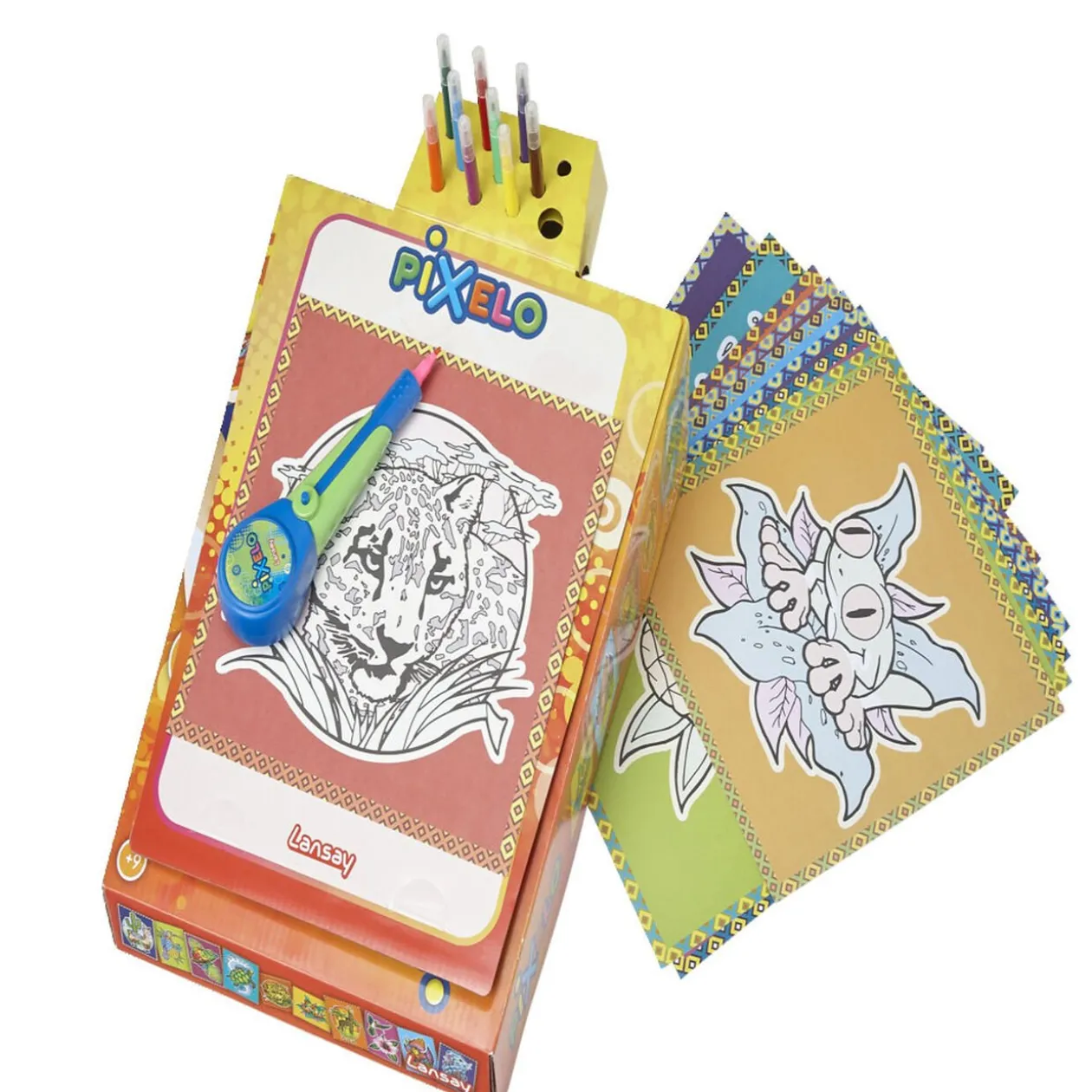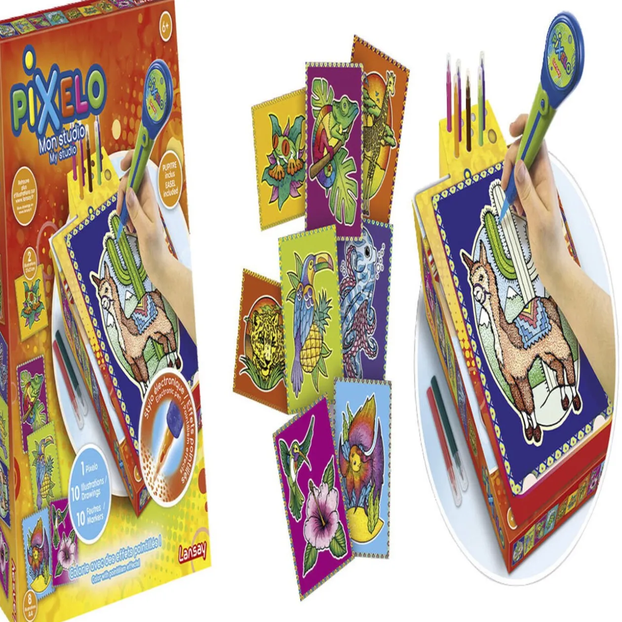 Le studio Pixelo est le moyen idéal de réaliser de superbes dessins en transformant votre boite en pupitre.Il vous suffit de choisir votre illustration préférée, puis utilisez votre Pixelo et coloriez avec des effets pointillés uniques.Contient : 1 stylo électronique, 8 illustrations A4, 2 illustrations 21×21 cm, 10 feutres, 1 notice.- À partir de : 3 ans – Fonctionne avec 1 piles type 1 pile LR03 non incluses
