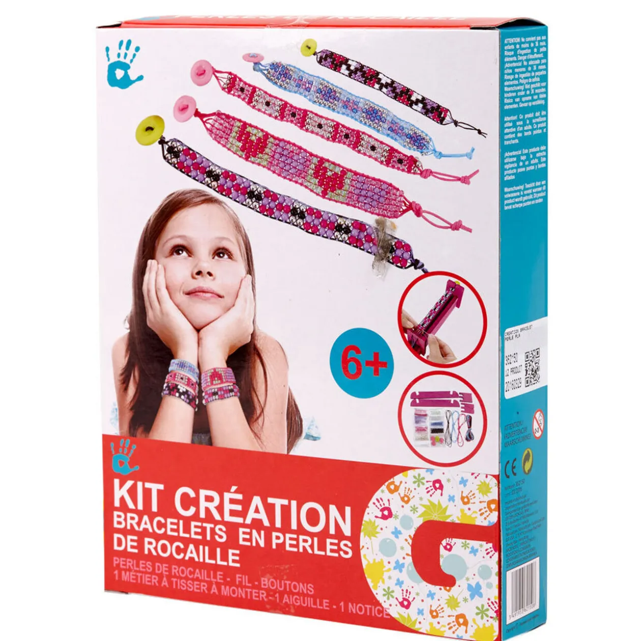 Kit de création de bracelets en perles de rocaille comprenant 1 métier à tisser à monter, des perles de rocaille, du fil, des boutons, 1 aiguille et 1 notice.