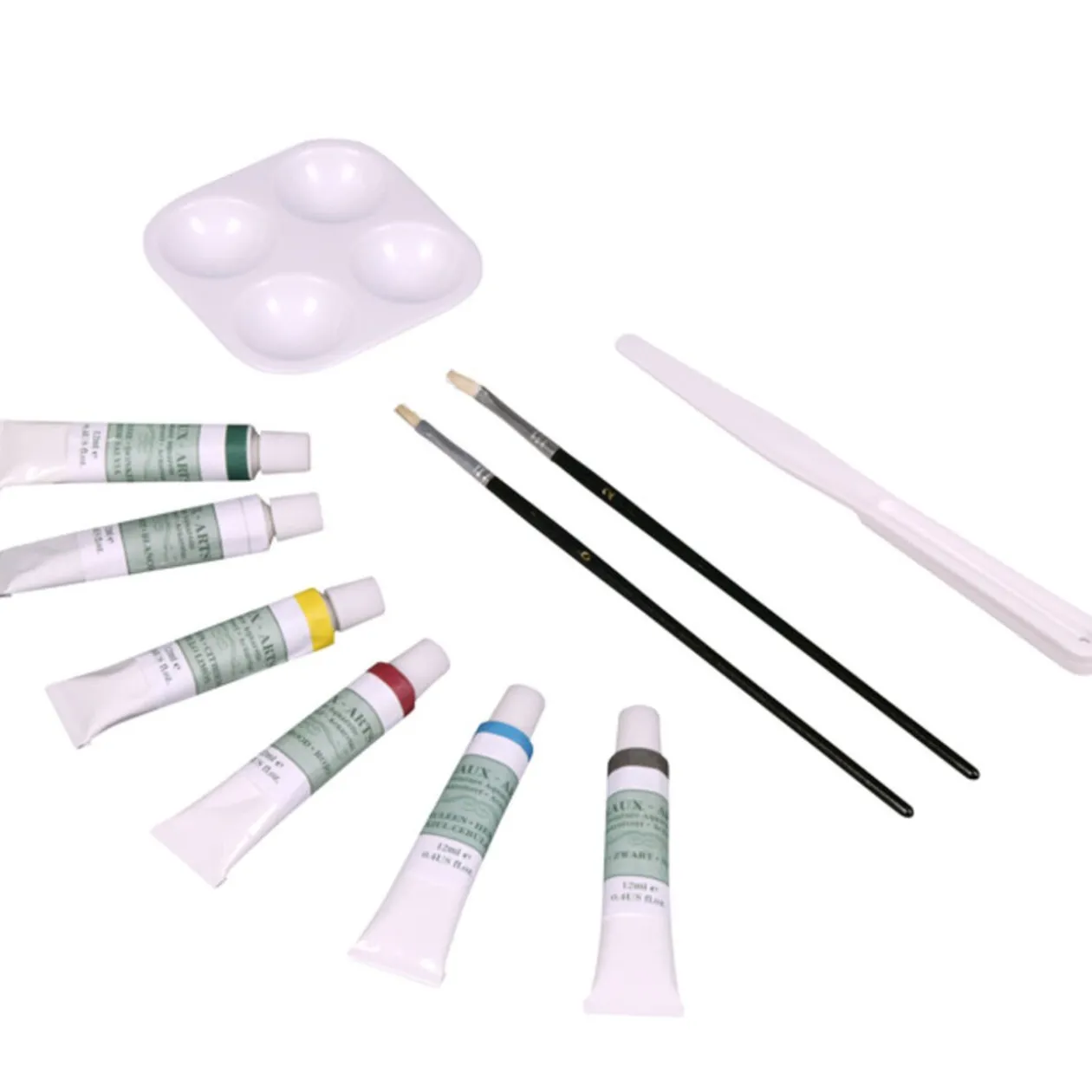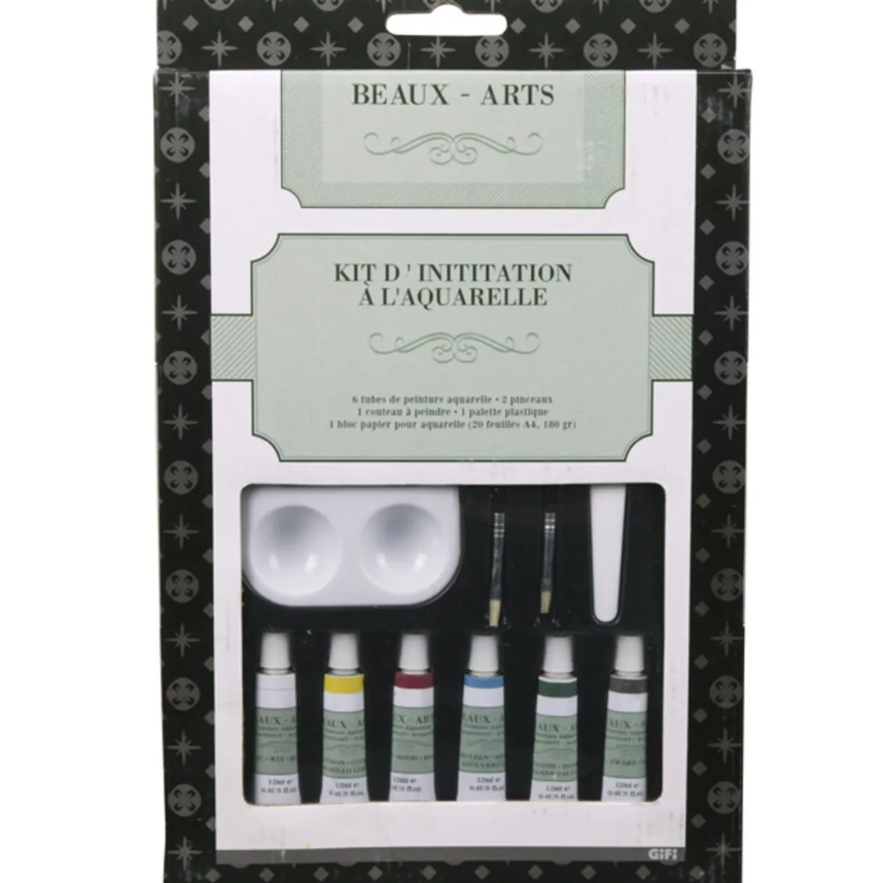 Kit d’initiation à l’aquarelle contenant 6 tubes de peinture aquarelle, 2 pinceaux, 1 couteau à peindre, 1 palette plastique, 1 bloc papier pour aquarelle (20 feuilles A4, 180 gr).
