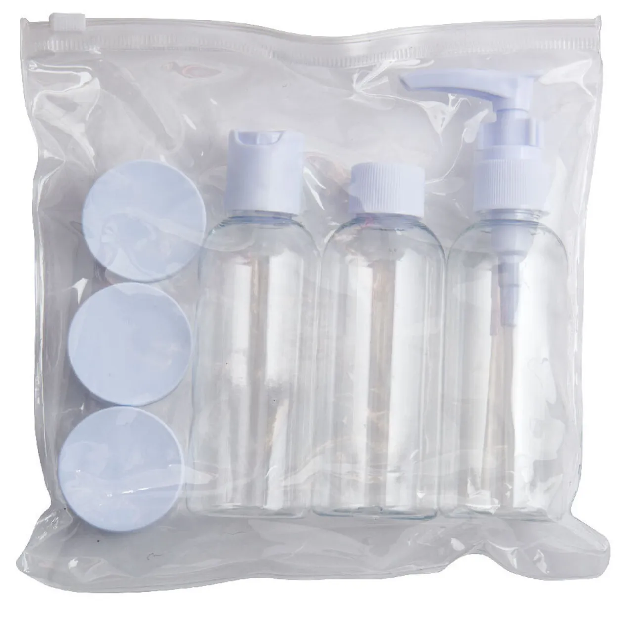 Kit voyage de 7 pièces, comprenant 1 pochette de 3 flacons dont 1 distributeur et 3 pots vides.