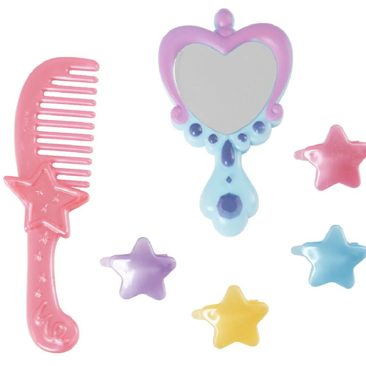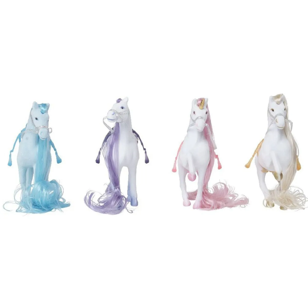 2 licornes, 2 juments et divers accessoires (peigne, miroir et pinces), plastique.