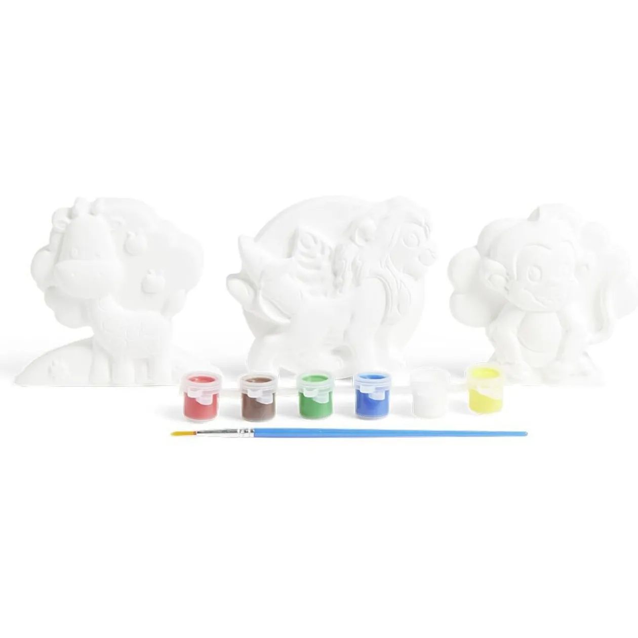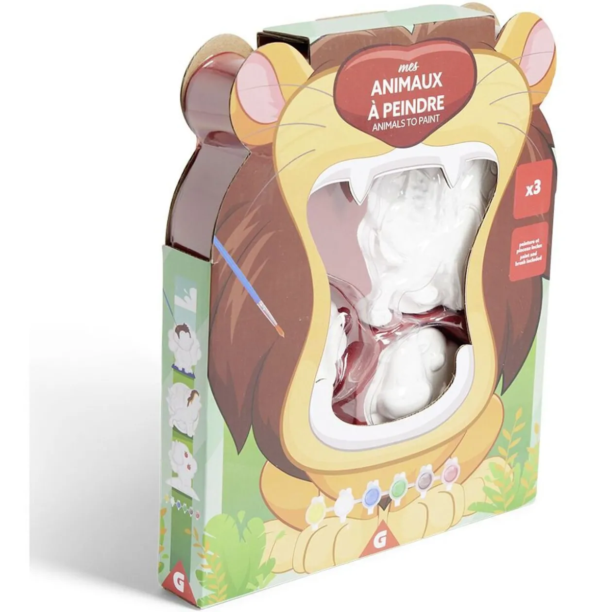 Votre enfant pourra laisser parler sa créativité avec ce kit sur le thème de la savane composé de 3 figurines en platre à peindre, un pinceau et un ensemble de 6 petits pots de peintures (jaune, blanc, bleu, vert, marron, rouge).