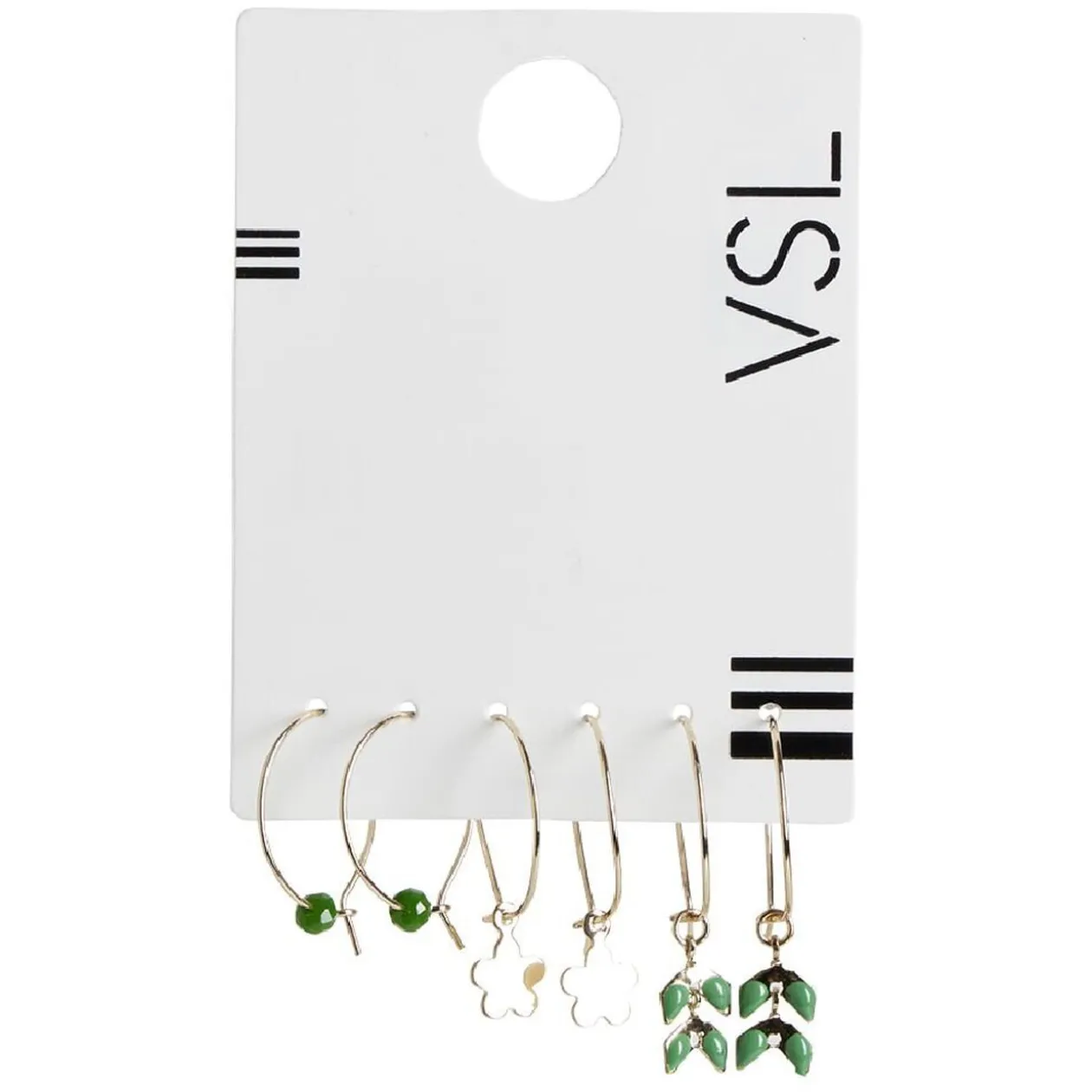 Une paire est ornée d’une perle verte à l’intérieur de l’anneau, une autre présente un pendentif fleur dorée, tandis que la troisième arbore un pendentif feuille vert et doré.