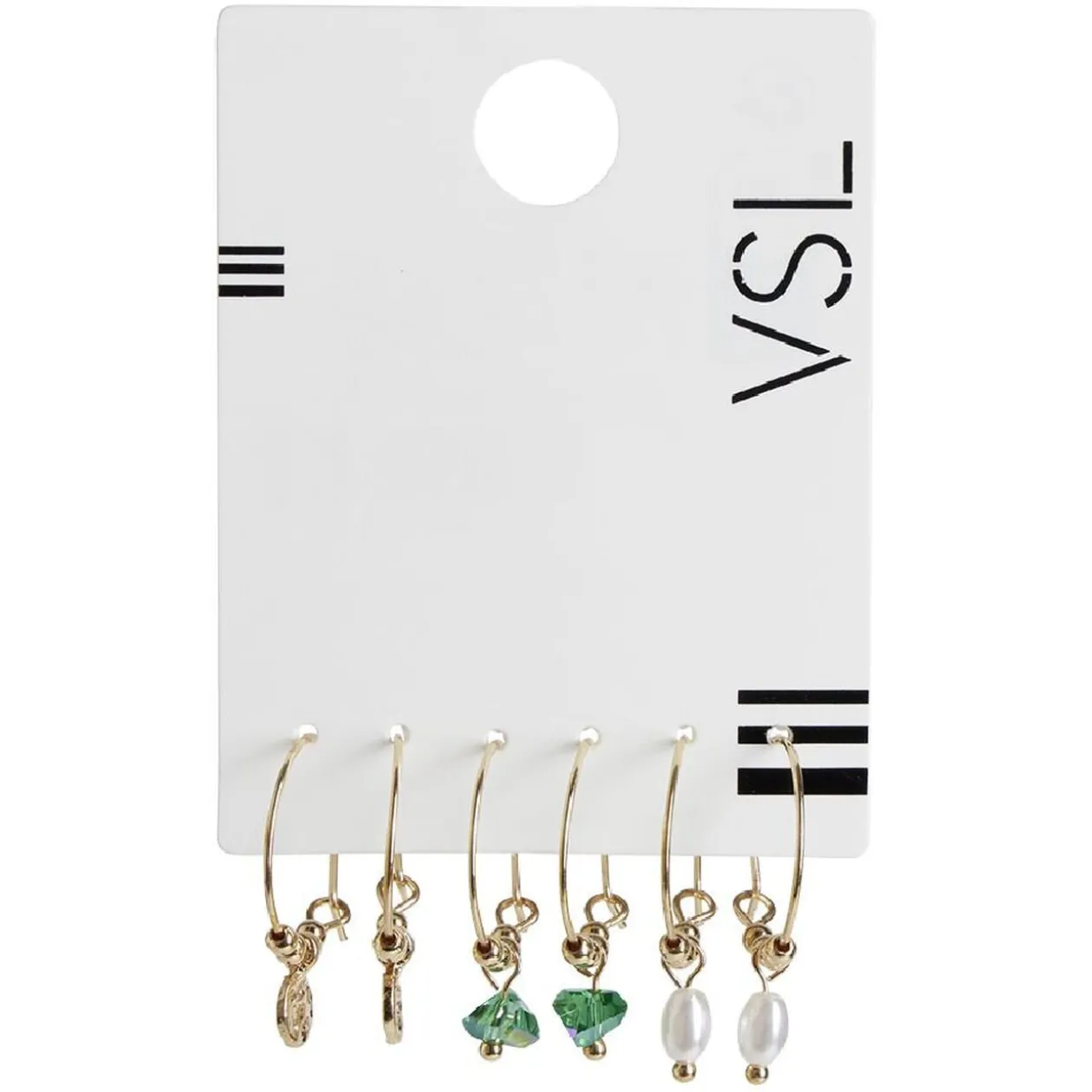 L’une présente un pendentif pampille martelé, la deuxième arbore une fausse pierre verte au fini naturel, tandis que la troisième est agrémentée d’une perle blanche élégante.