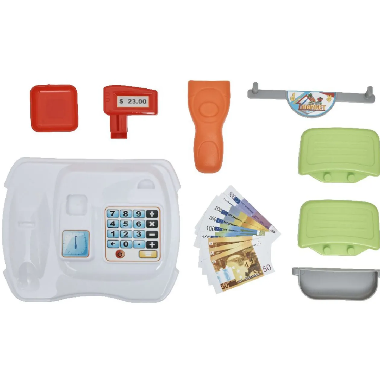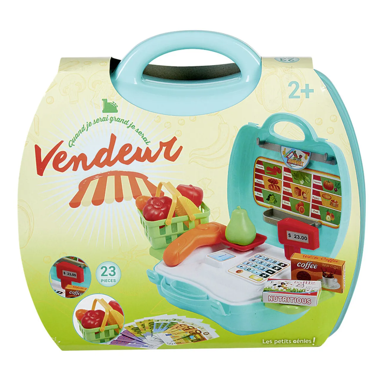 Allez au supermarché et réglez vos courses c’est facile avec la mallette de marchande! Elle comprend une caisse enregistreuse et de nombreux accessoires pour vendre et acheter à bon prix!.
