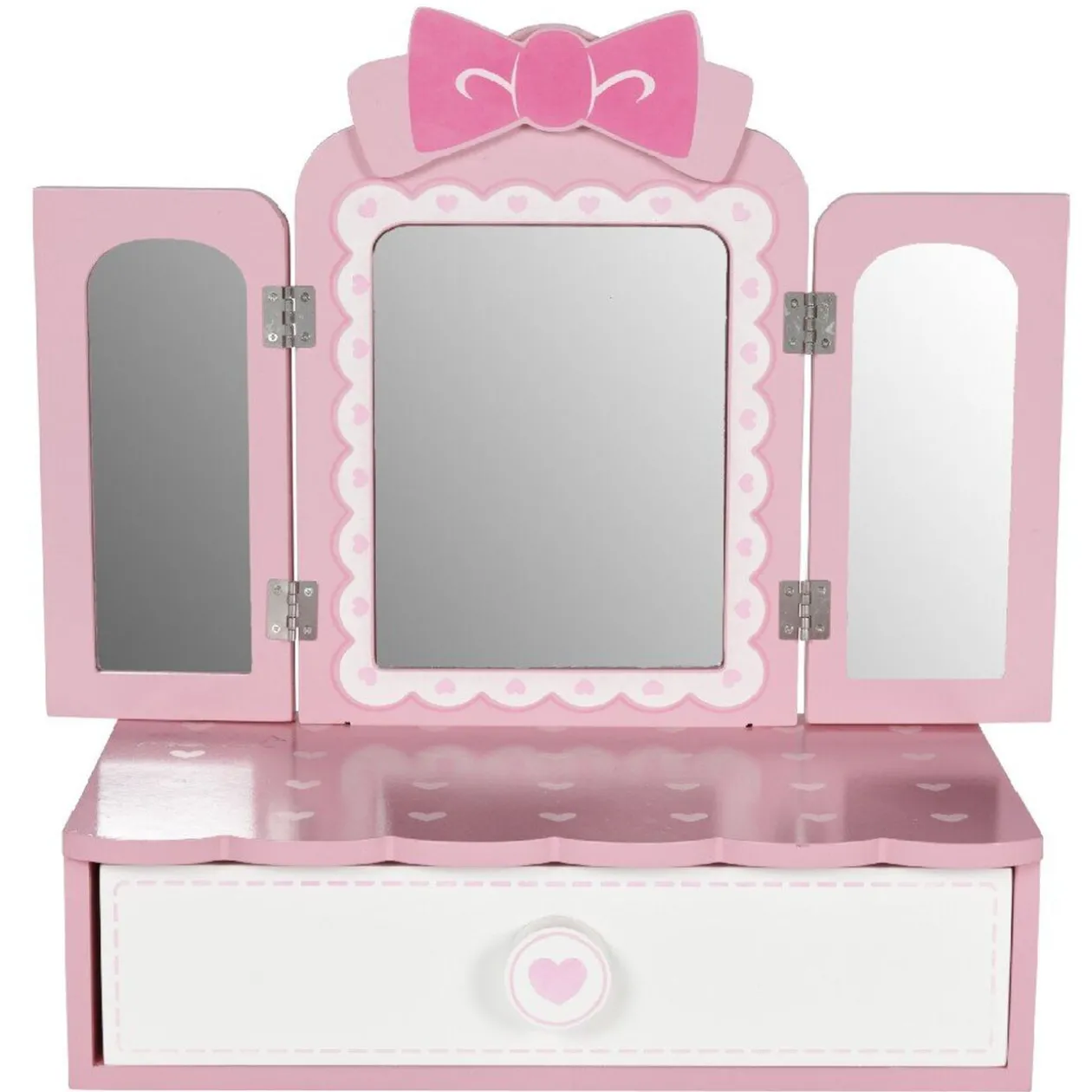 Mini-coiffeuse à poser, pour enfant, en bois rose et blanc avec miroir, volets refermables et 1 rangement tiroir pour maquillage et accessoires.