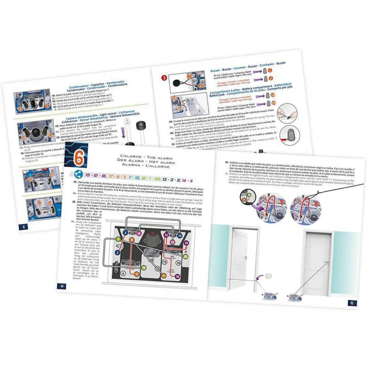 Le kit permet de réaliser 6 activités afin de construire une alarme. Les composants sont à assembler sans soudure donc sans danger pour l’enfant.