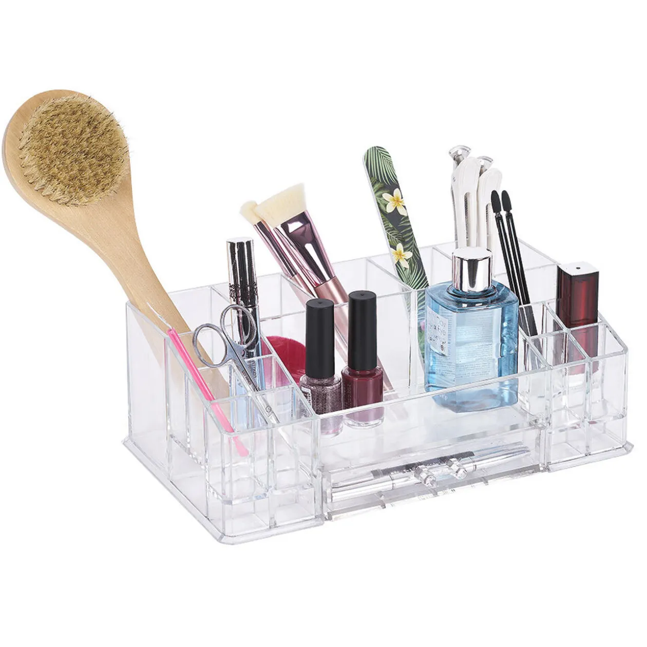 Organisateur transparent pour cosmétiques et autres accessoires.