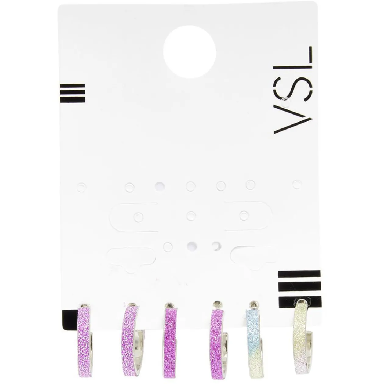 3 paires de petites créoles pailletées roses, violettes et arc-en-ciel.