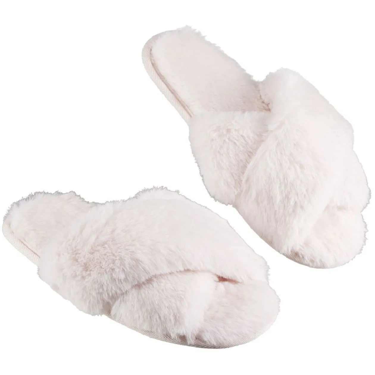 Paire de chaussons à brides croisées en polyester duveteux rose.