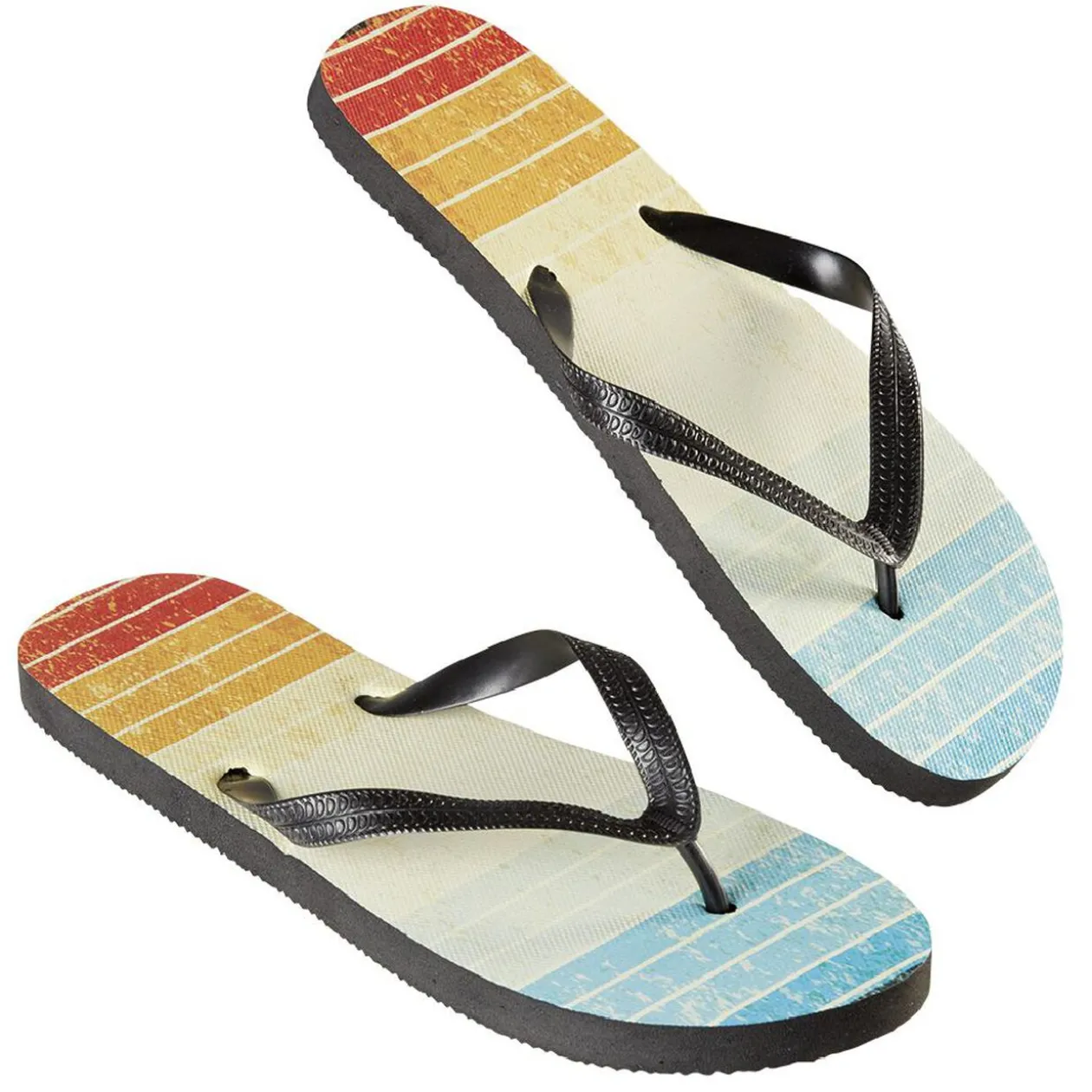 Paire de tongs à motif rayé bleu, jaune et rouge en pointure 42/43.