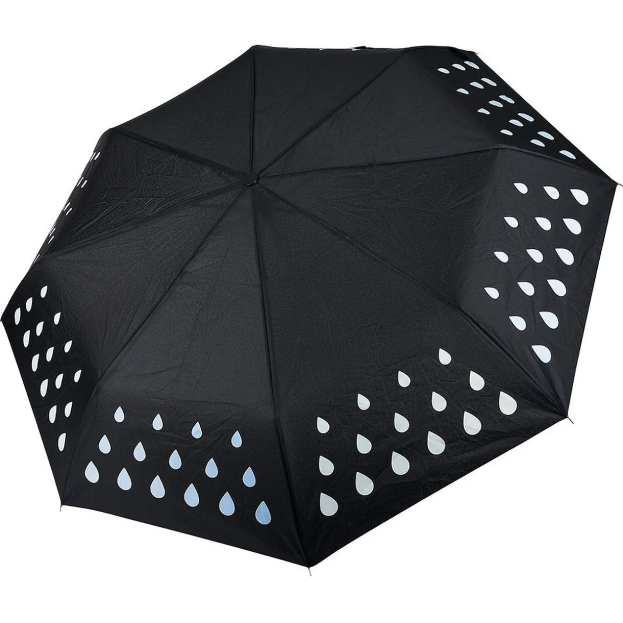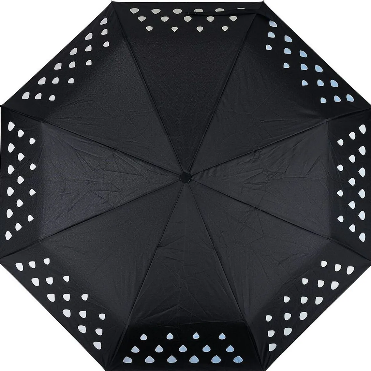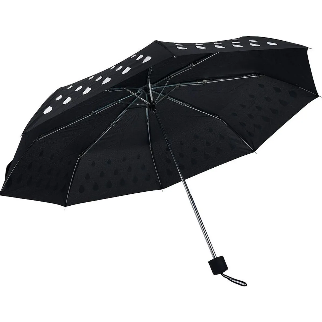 Parapluie noir motif gouttes blanches qui deviennent multicolore au contact de la pluie.
